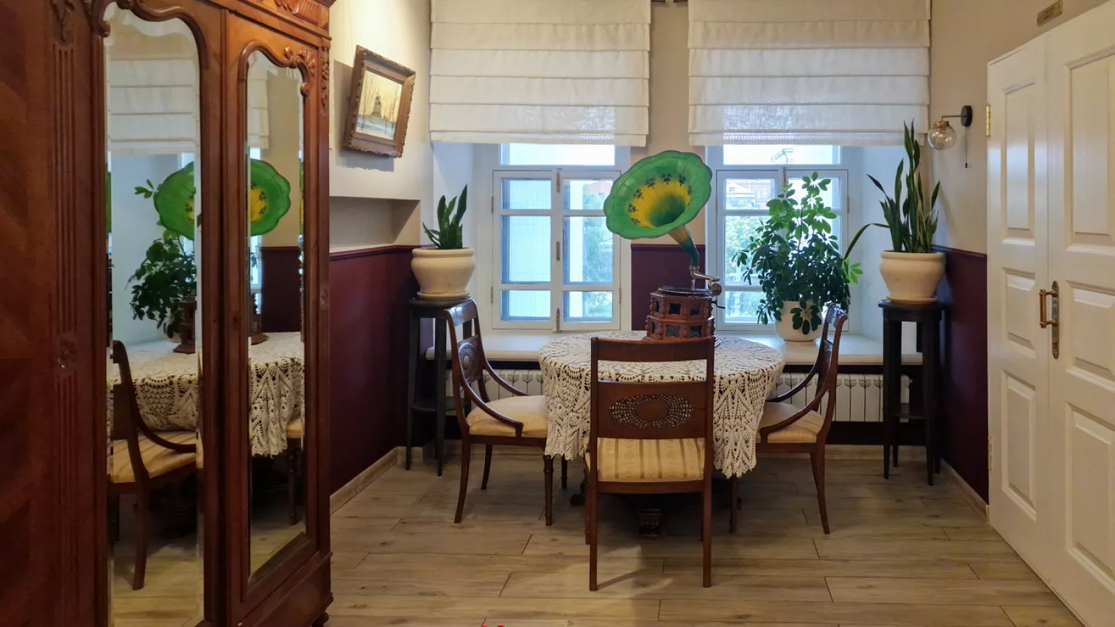 Дом полностью отреставрирован: сохранились фасады, архитектурные детали, аутентичные элементы интерьера. Гостям предлагаются номера с удобствами, оформленные в стиле эпохи — с мебелью под старину, гравюрами, тканями ручной работы. Здесь можно не просто остановиться, но и погрузиться в атмосферу купеческого Енисейска.