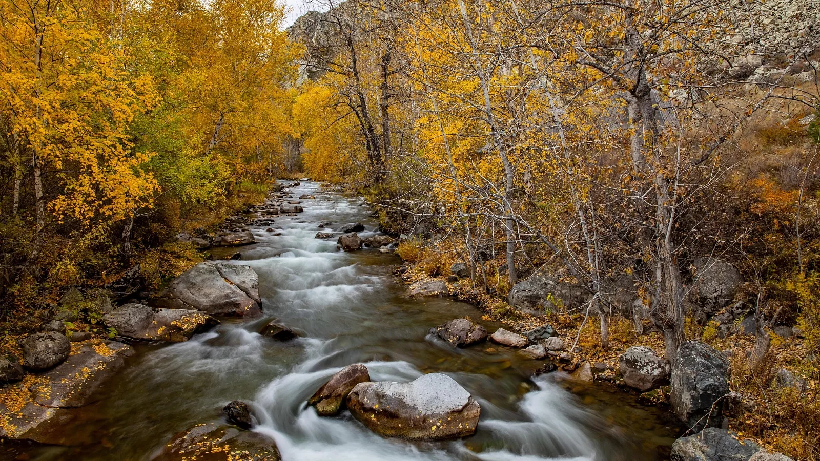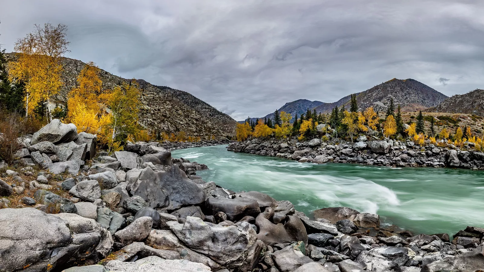 Следующая точка — Ильгуменские пороги. Река Катунь тут показывает характер: вода ревёт, кипит, бьётся о валуны, а в обрамлении осенней листвы всё это выглядит как живое полотно. Мы спустились к устью речки Большой Ильгумень — она тоже по-своему хороша, особенно с высоты — яркая лента между жёлтых деревьев.