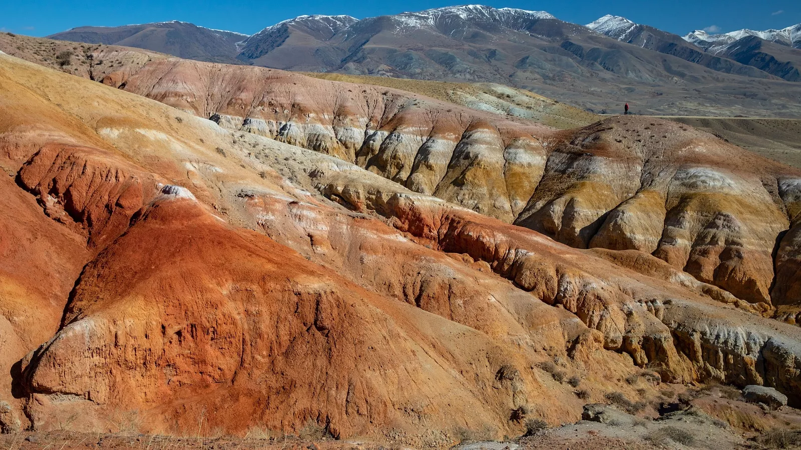 Начали с того, что направились в Кызылгирскую свиту — именно так официально называется местность, которую туристы давно окрестили «Марс» или «Марс-1». Горы здесь действительно напоминают инопланетный ландшафт. Красные, охристые, жёлтые, лиловые полосы — словно кто-то выкрасил их вручную, слой за слоем.