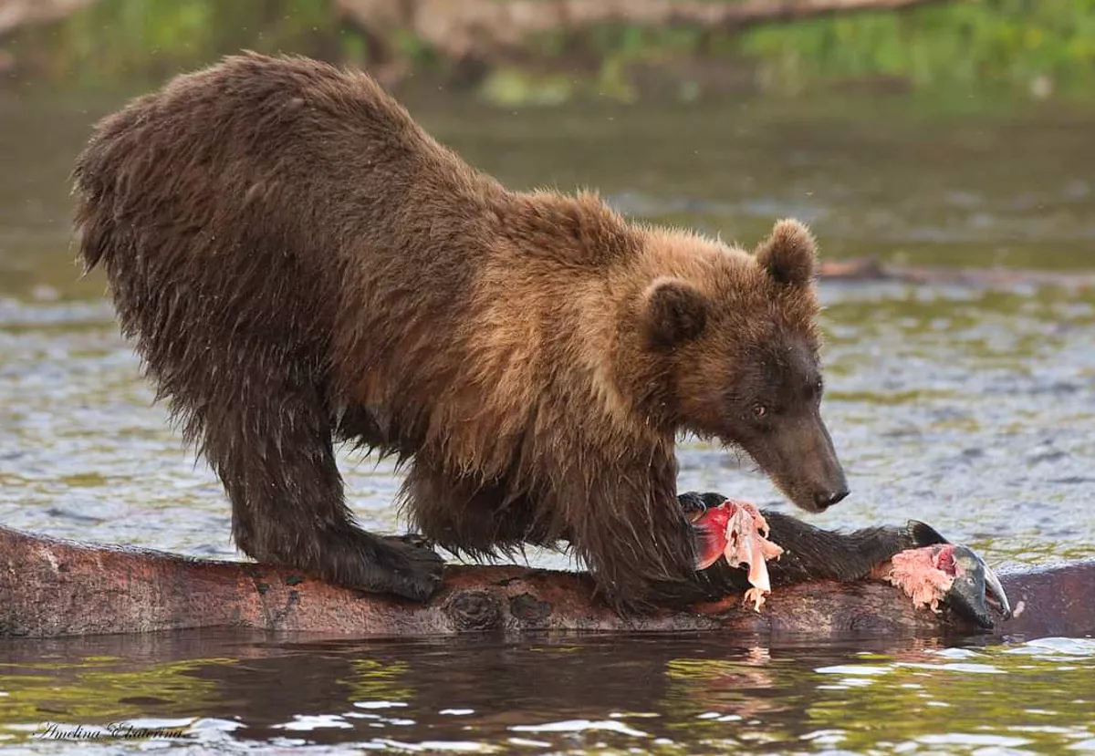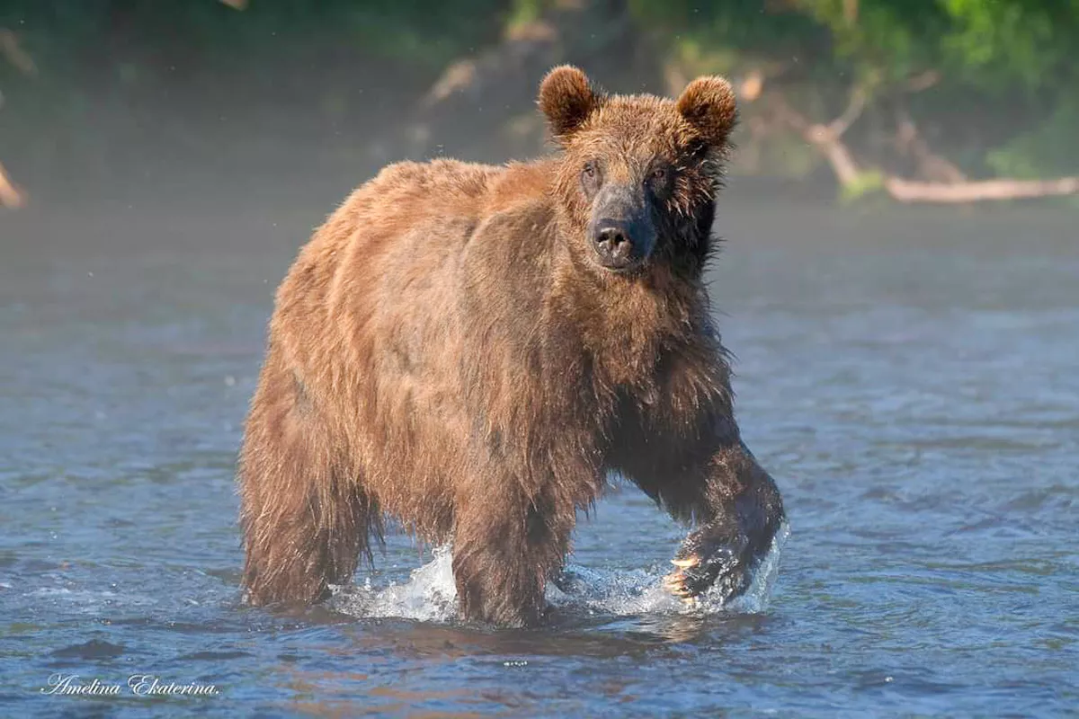 К медведям идти примерно километр в сопровождении егерей на берег реки, полной нерки. На место один раз принесли стулья и оставляли их там на дереве, чтобы медведи не добрались. Есть смотровая площадка примерно высотой 2 этажа. Мишек много, одновременно видели 7 , но чаще 2-3 в разных точках. 2 медведицы тусили на противоположном берегу реки, слава Богу к нам не приближались и часто выясняли свои отношения в лесу. Оттуда доносилось страшное рычание, а их дети, как обезьяны, залазили на деревья.