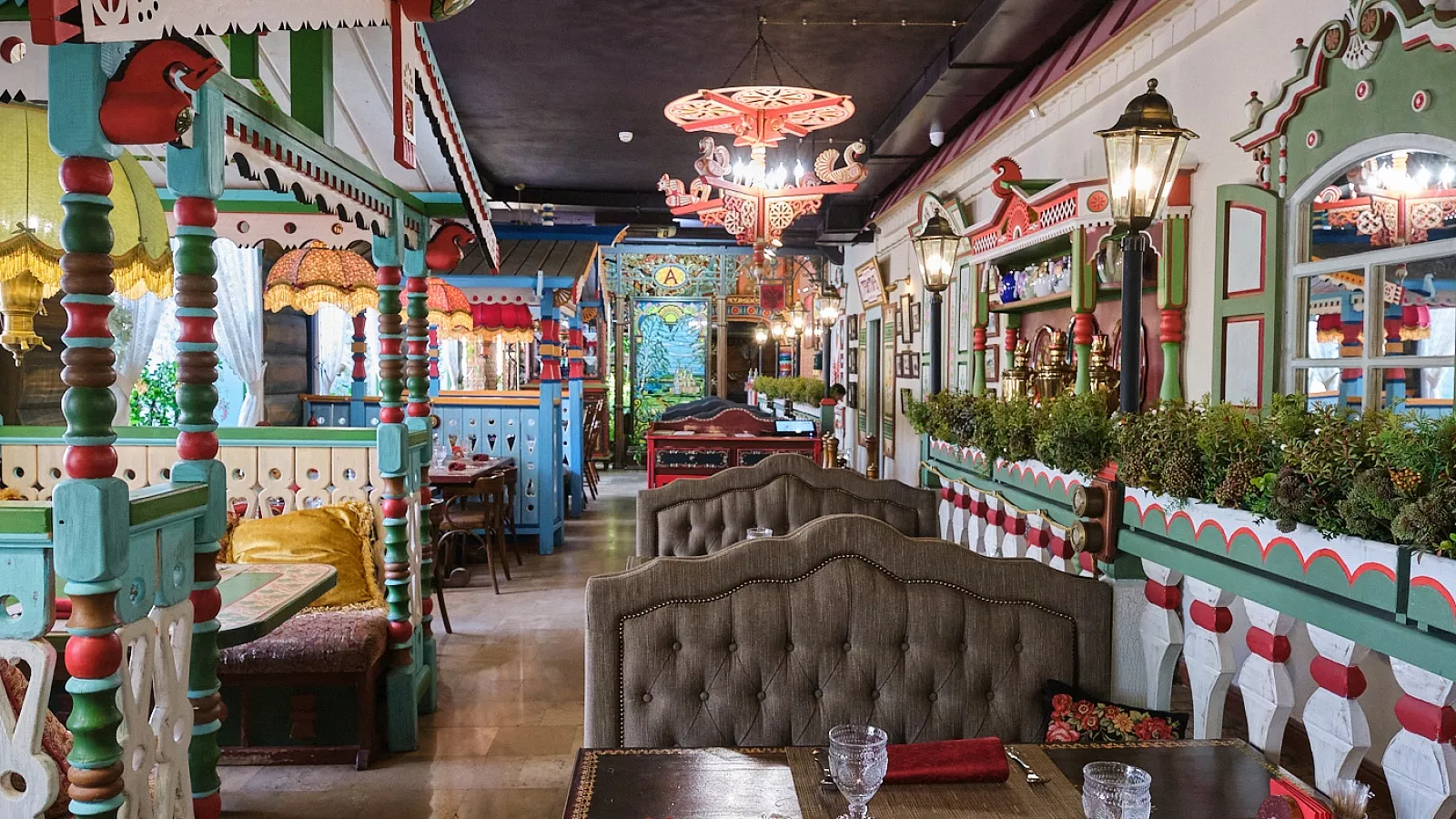 Атмосфера: Элегантный национальный стиль с современными акцентами. Интерьер оформлен в тёплых тонах, с использованием дерева, шкуры и традиционных орнаментов.