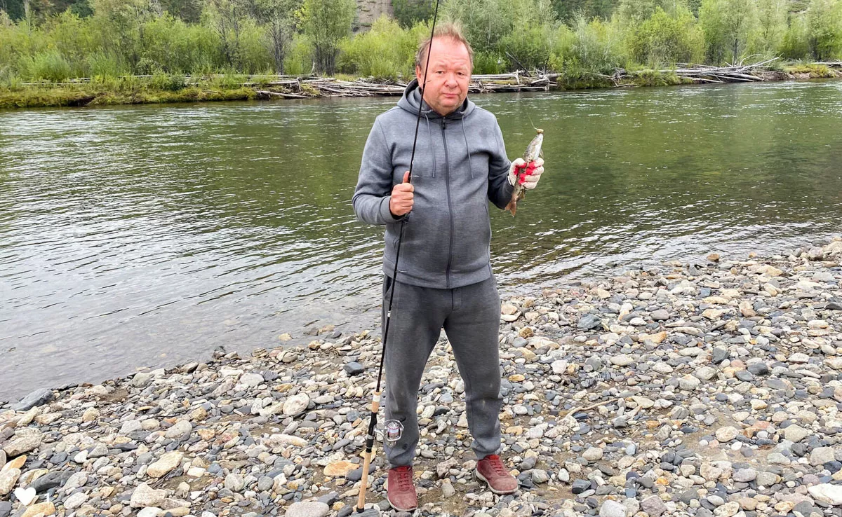 Рыбалка. Можно хариуса ловить на мушку, а можно на блесну. Нам мушку эффективнее. Две мухи разного цвета. Одна летит над водой, другая скользит по камню. Но это на той стороне реки, глубокое русло подходит к берегу. Паша может перейти, а отсюда приходится рыбалить на блесну. Паша пояснил: леску смотал, пальцем прижал, фиксатор переключил, замах, бросок и отпускаешь пальцем леску. Грузило падает, сразу переключаешь скобу на подмот и начинаешь мотать, чтобы блесна не зацепилась за камень. У Паши всё получается слажено. Я тренируюсь, вроде начинает получаться, но зацепляюсь за дно, Паша помогает вытащить, войдя в воду до середины реки. Только одного хариуса я все же смог вытащить самостоятельно! Да! Перед тем, как рыбу снимать с тройного крючка, её надо камнем оглушить по голове, а иначе она не даст вытащить крючок, будет извиваться. Стал ловцом и убийцей рыбы.