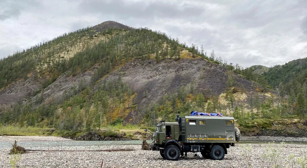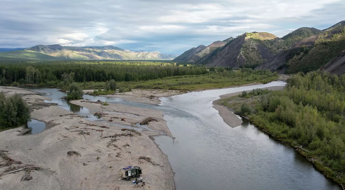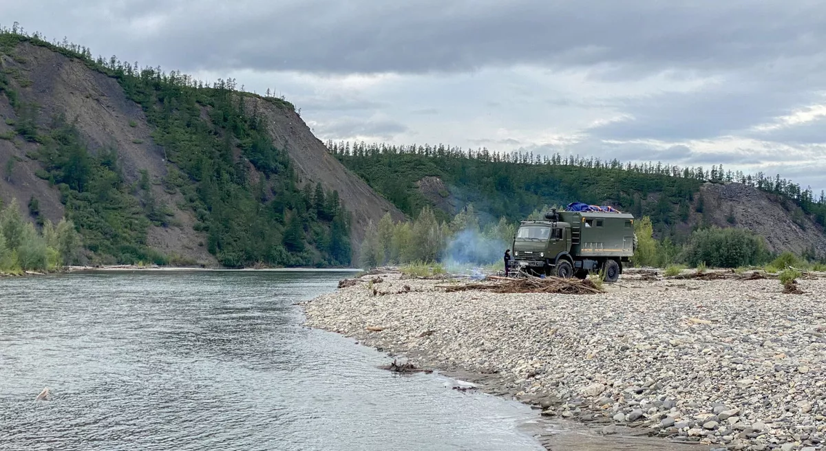Поворот направо, 40 километров в сторону Магадана и еще один поворот направо. Встали на главный путь нашего дикого путешествия. Минут 20 вдоль реки Хета по каменистым берегам среди русла и Павел неожиданно останавливается: — здесь заночуем. Кунг открыт: из него достаём генеральское кресло, маленькие стульчики, стол, чайник, большой синий ящик с едой. Романтика началась! Павел действует спокойно и сноровисто, достаёт мотопилу, начинает резать сушняк, который в достаточном количестве раскидан повсюду вдоль реки, берега подмываются, деревья сползают, кренятся (иногда очень драматично) и падают, их выносит на берег.