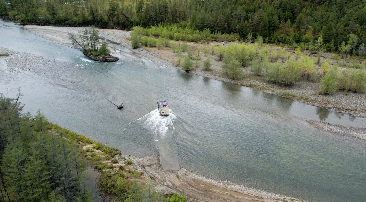 Получили калории — пора их тратить! Едем в красоту! Тут начинается нечто! Дорога (если так можно назвать едва уловимый путь) всё чаще и чаще пересекает реку, иногда на некоторое время продолжаем путь по руслу. Останавливаюсь для пояснений. Дальше можем проехать только мы со снаряжённой массой 12 тонн, или машины, имеющие большую массу и полный привод. Остальные, включая брутальные джипы, может снести течением, или камни под ними начнут проваливаться. Перед въездом в реку Павел включает блокировку дифференциала и понижайку, машина прёт как луноход! Здорово! Офигенное впечатление вседозволенности. Никому невозможно проехать, а мы можем! Смотрю через окно на воду, подступающую к стеклу, невозможно!