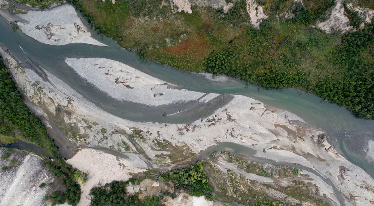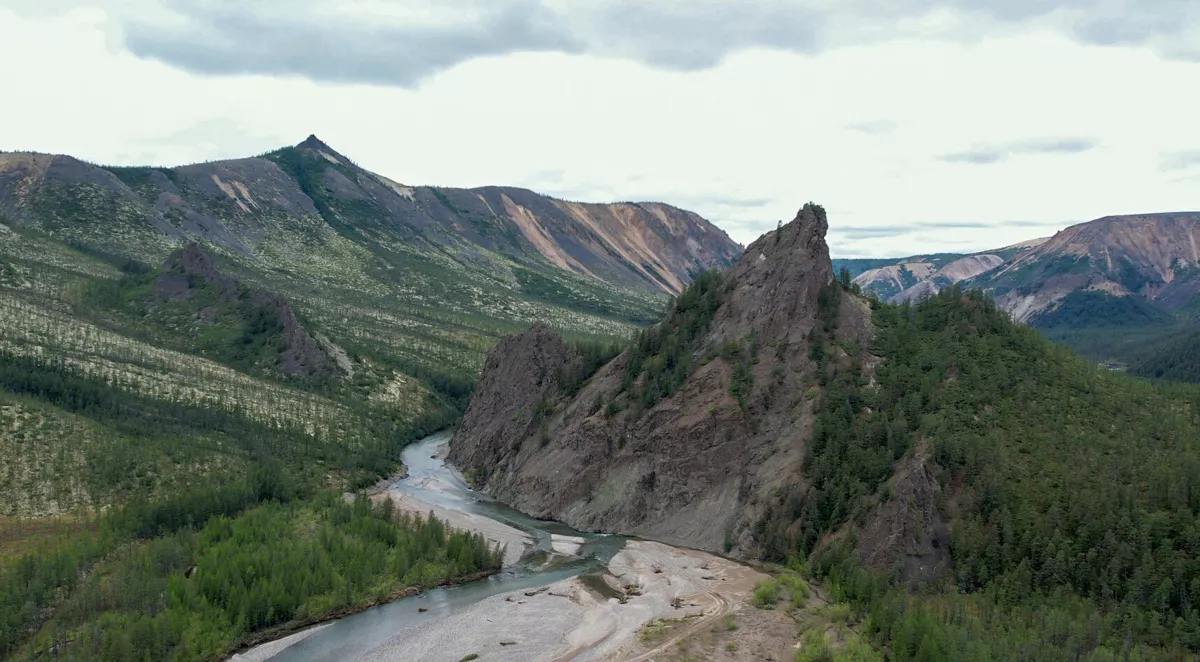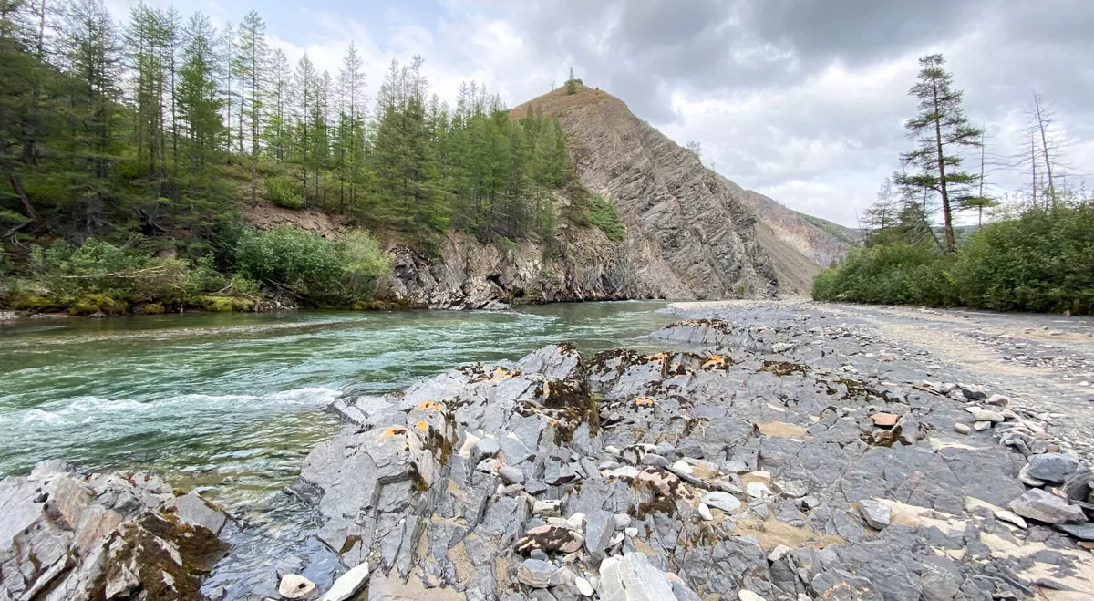 Сказано — сделано, выгружаемся на галечный выступ на берегу ручья Носэгчан. Нас встречает туча гнуса, пока мы такой не встречали, только на руднике был похожий. Есть репелленты, но Павел говорит: костёр и дым-лучшее средство! Как обычно, дрова под рукой, костёр разведён, хотя мошкара борется до последнего. Я, наконец достал свой дрон и моментально потерял его в ближайшем лесу. Спасибо функции поиска, мы с Павлом быстро определили его месторасположение и вернули обратно.