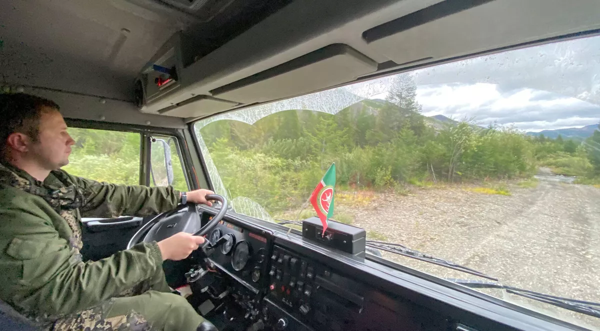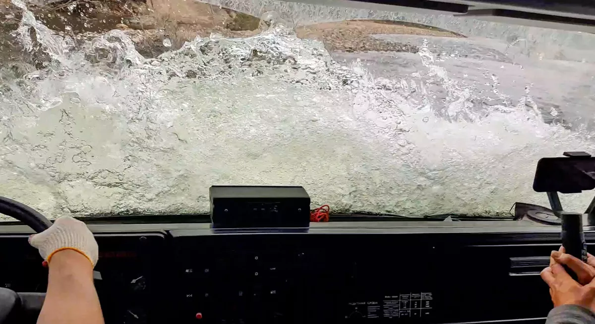 Погнали! Вдоль красивых сопок, по речке, вода эффектно вздымается на уровень боковых окон и на ветровое стекло.