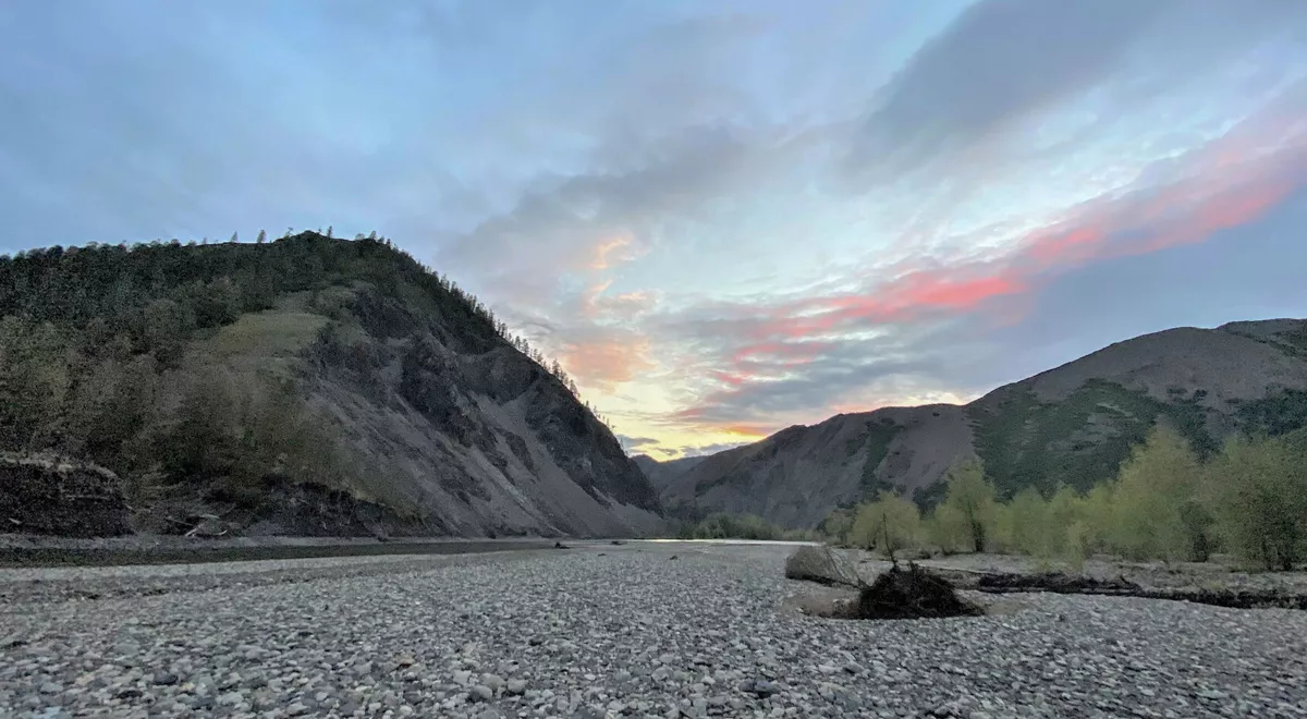 Тот же успокаивающий шум воды, невысокие сопки, украшенные закатом, разбиваем лагерь, Павел в забродах уходит на другую сторону реки, переходит вброд по пояс и встаёт перед нами на противоположном берегу. И вот я вижу: первая, вторая, третья… Без ухи не останемся! В результате восемь! Три на уху, пять запекаем по Пашиному рецепту. Посыпать специями, положить на луковые кольца сверху, добавить снизу, замотать фольгой и положить в костёр на решётку. Всё получилось.