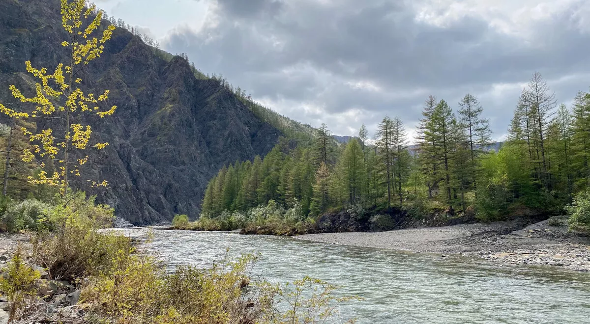 Короткая остановка насладиться бирюзовым цветом реки, яркой зеленью и красивой сопкой. Лето совсем короткое, поэтому в августе мы повсюду видим сочную молодую зелень, хотя одновременно проглядывают приметы золотой осени.