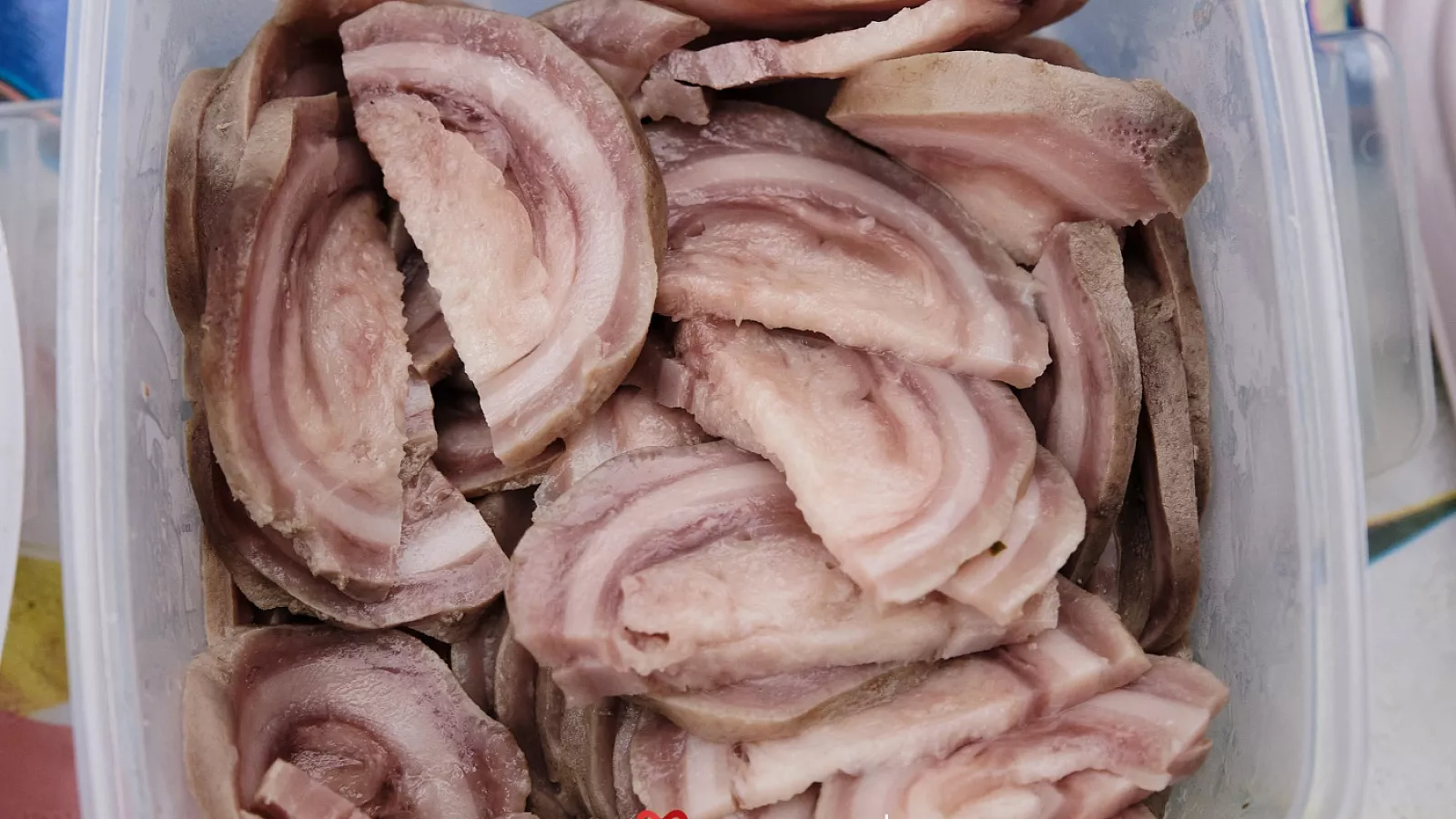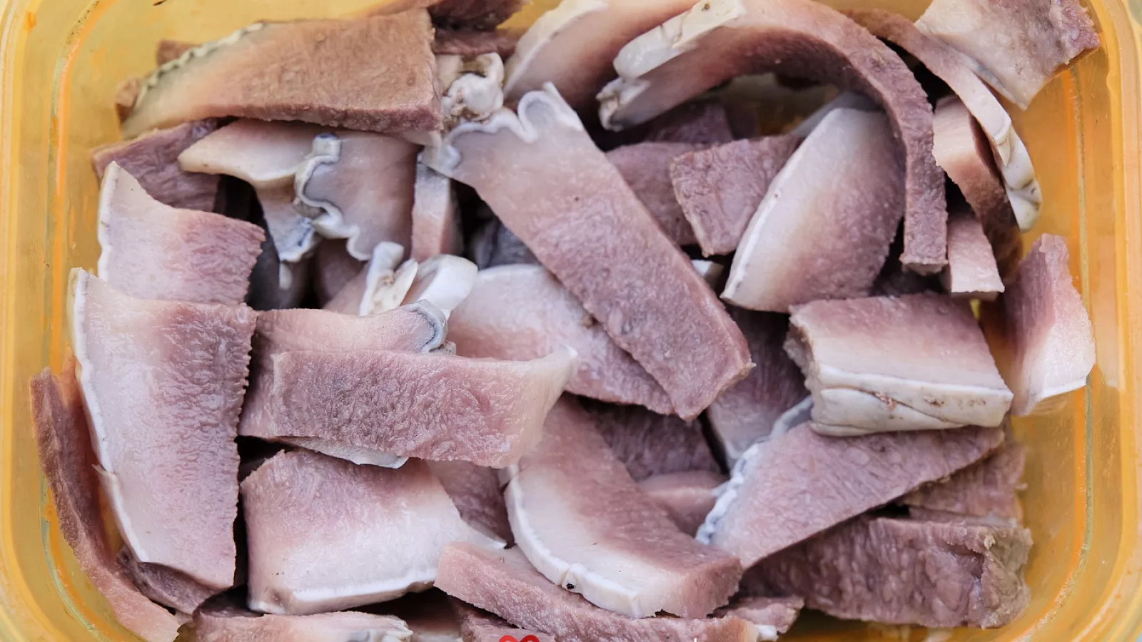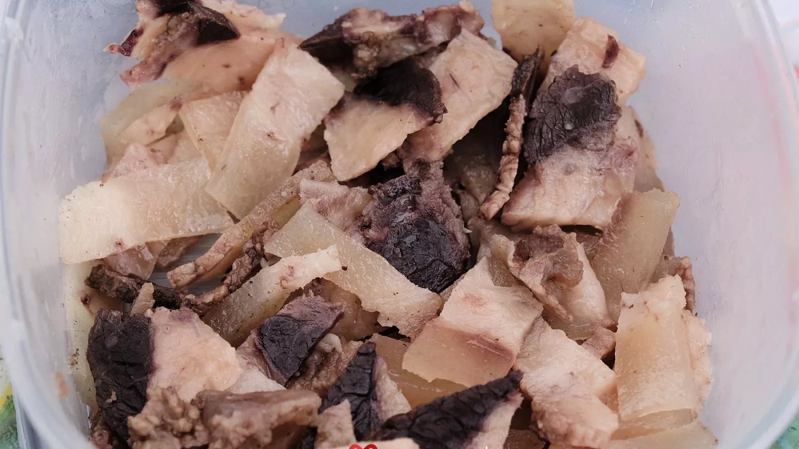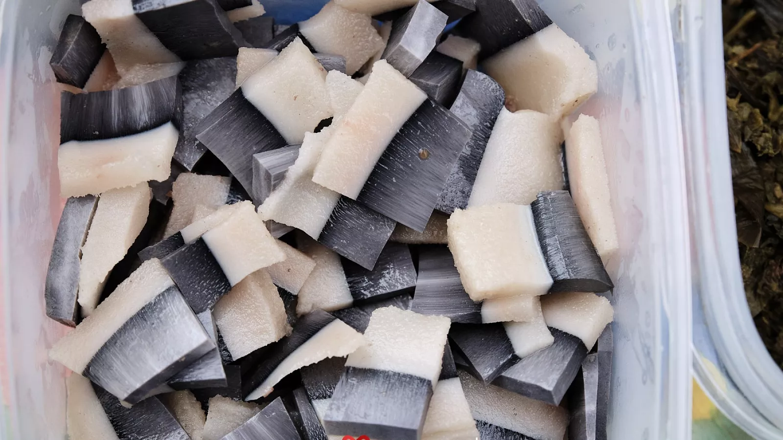 В отличие от свиного сала мантак нарезается мелкими кусочками (полсантиметра в ширину и 2 см в длину). Такая нарезка обусловлена очень вязкой структурой сала, разжевать такое угощение не просто.