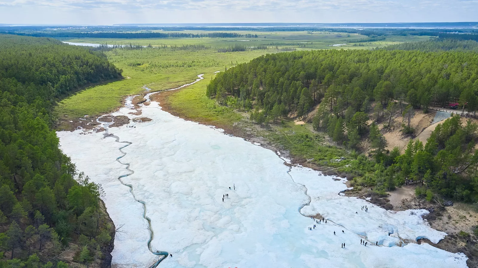 Речные наледи Якутии абсолютно уникальное природное явление, характерное для вечномерзлых территорий, где весной и зимой под давлением подземных вод из трещин грунта или русел ручьев на поверхность прорываются источники. Вода при этом сразу же замерзает, образуя мощные ледовые пласты, которые могут достигать нескольких метров в толщину и покрывать десятки гектаров. Эти наледи не тают даже в тёплое время года, создавая ледяные поля и каскады посреди тайги и скал. Одной из самых известных и масштабных является Момская наледь — труднодоступный ледяной массив на северо-востоке Якутии, где наледи простираются на десятки километров. Булуус — тот же тип природного объекта, что и Момская наледь, но в миниатюре и с куда более удобной логистикой. Главное его преимущество — близость к Якутску, что делает его идеальным вариантом для первого знакомства с этим удивительным явлением. Чтобы добраться до Булууса, не нужно готовить сложную экспедицию или арендовать вертолёт: сюда можно съездить всего за один день, почувствовать дыхание вечной мерзлоты и увидеть своими глазами, как лед способен противостоять даже летнему зною.