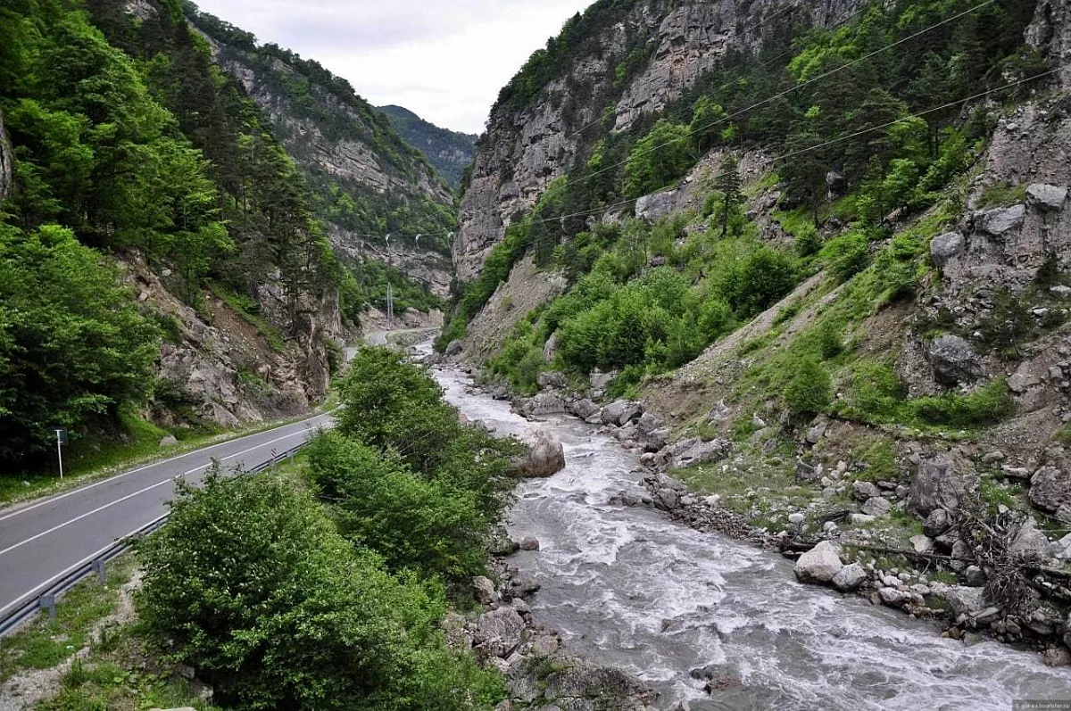 Третий день. Рано утром нас ожидала дорога в Грузию. Магомед, бывший военный, на своем комфортном минивэне Hyundai вёл нас через Кавказский хребет. Это было удивительное и комфортное путешествие: он рассказывал про реки, монастыри, крепости и башни. Остановка у Арки дружбы народов, Успенского собора в Ананури (XVII век) и некоторые другие достопримечательности сделали маршрут насыщенным. В дороге с нами — Мадина из Москвы, очень интеллигентная и приятная спутница. Поездка прошла быстро и безопасно.