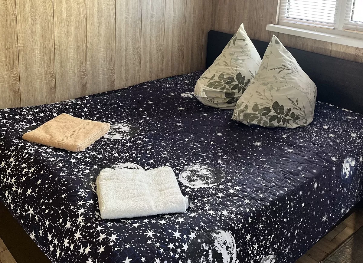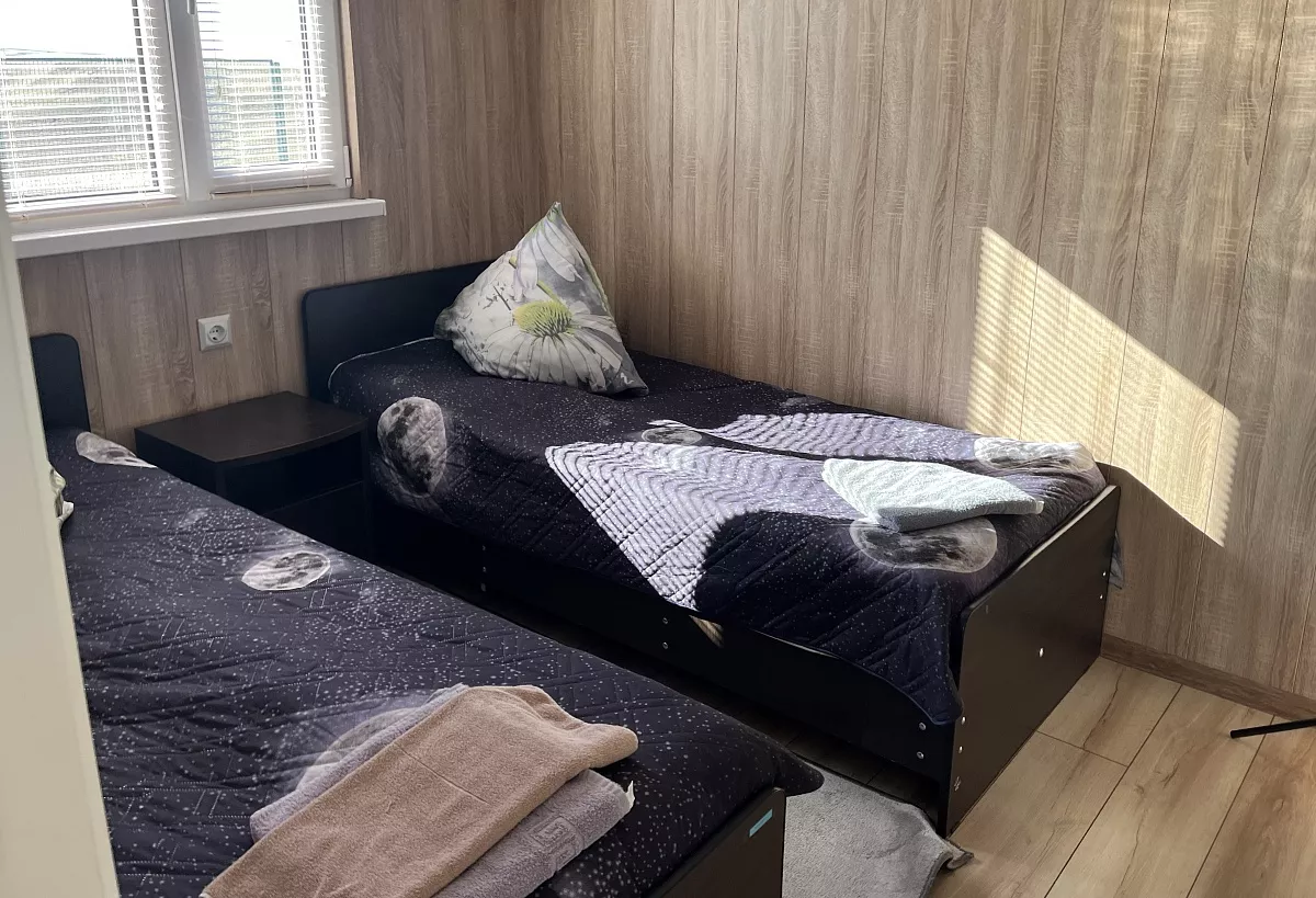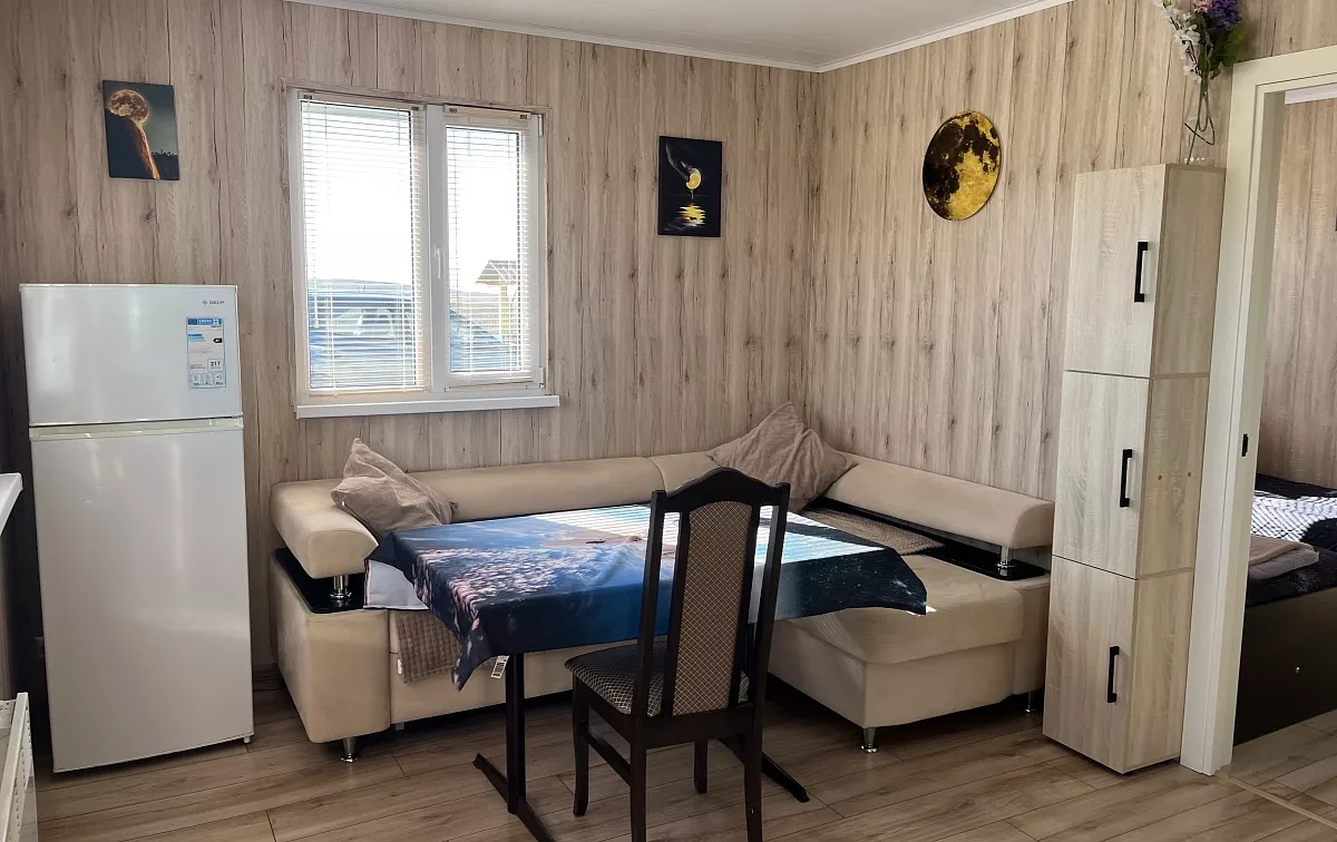 Проживание в домиках. В домиках 3 комнаты: 2 спальни с двумя раздельными и совместными кроватями и общая зона и прихожая с диваном, холодильником, чайником, микроволновкой. В домиках есть все условия душ и туалет.