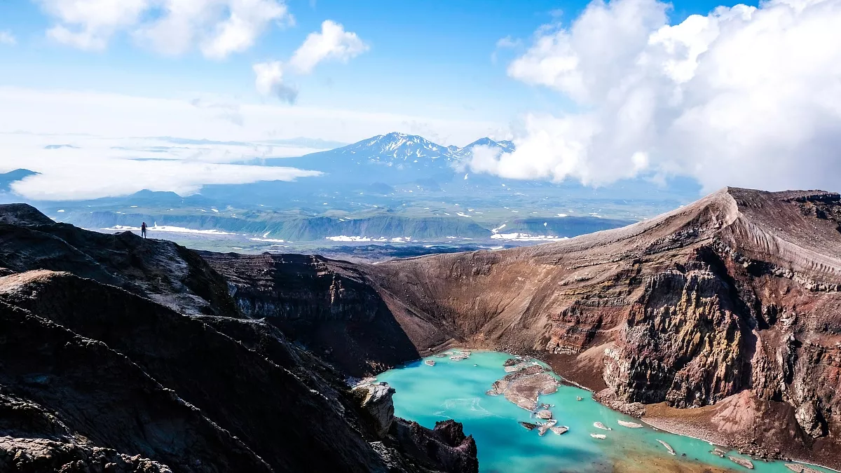 Наверху, с кромки кратера, мы лицезрим шикарный вид на вулкан Вилючинский. Под ногами, обрываясь вниз на сотни метров, открывается огромный кратер с озером на дне. Это эпичное зрелище впечатлит даже самых искушенных путешественников.