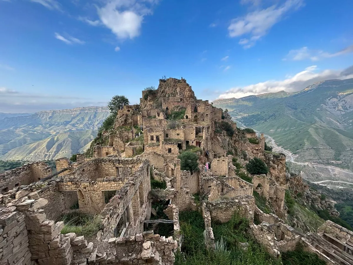 Село призрак Гамсутль, потрясающий вид со стороны на село Гуниб. Несмотря на то, что горный аул Гумсутль давно заброшен и находится в труднодоступном месте, высоко в горах, поток туристов туда не иссякает. Еще несколько десятилетий назад в аул вела автодорога, но сегодня от нее осталась только узкая тропа.Подняться к аулу можно пешком. За дополнительную плату можно доехать на джипах местных жителей.