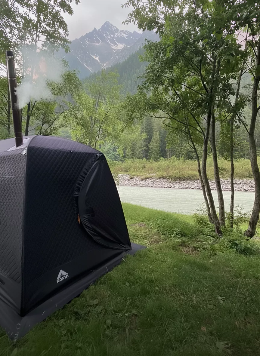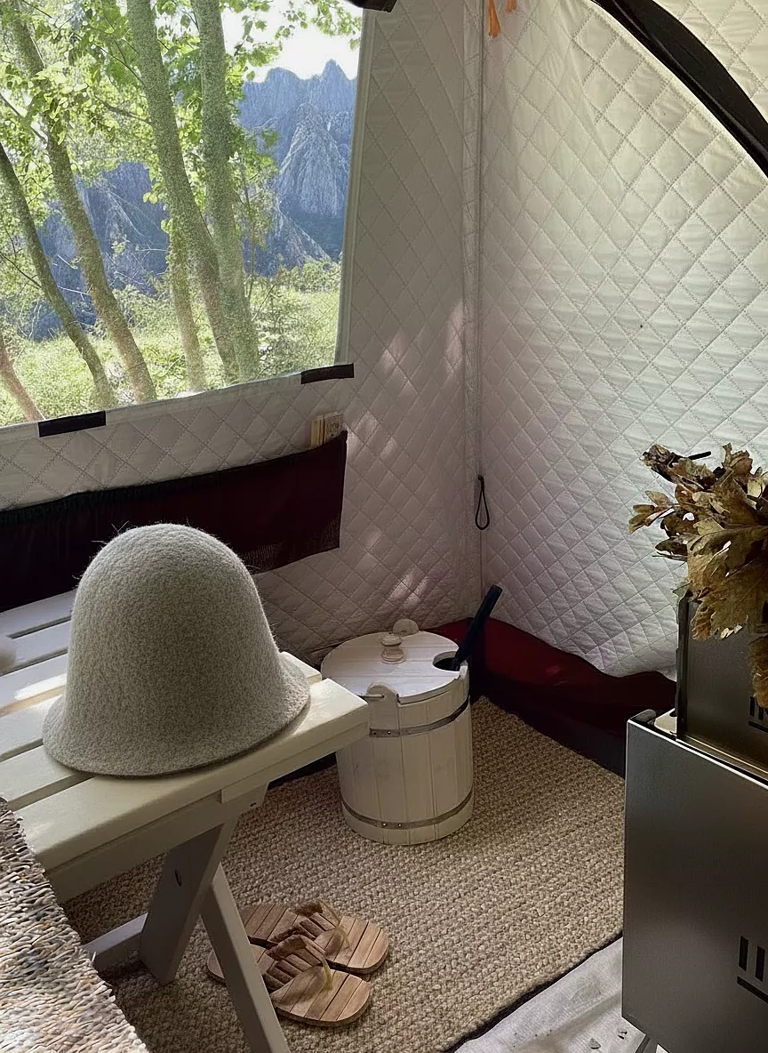 SPA и гигиена: походная дровяная баня, оборудованная печью, полками и банными вениками для полноценного парения; душевая кабина (палаточного типа) с подачей горячей воды; биотуалет (палаточного типа) современный и гигиеничный.