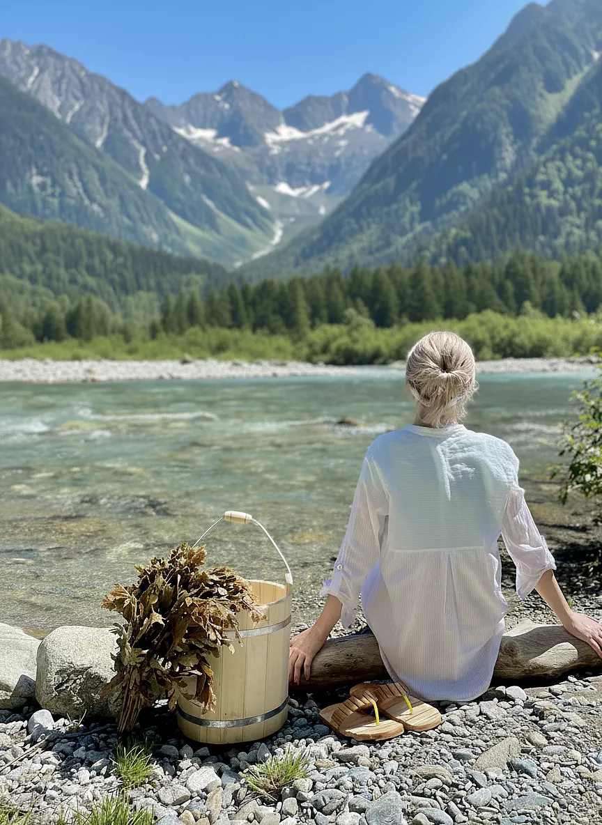 По возвращении дровяная баня-восстановление с купелью в горной реке, окончательно смывающая дорожную пыль и городской шум, а также с ароматным чаем из горных трав (авторские сборы трав от Анны) и диким мёдом.