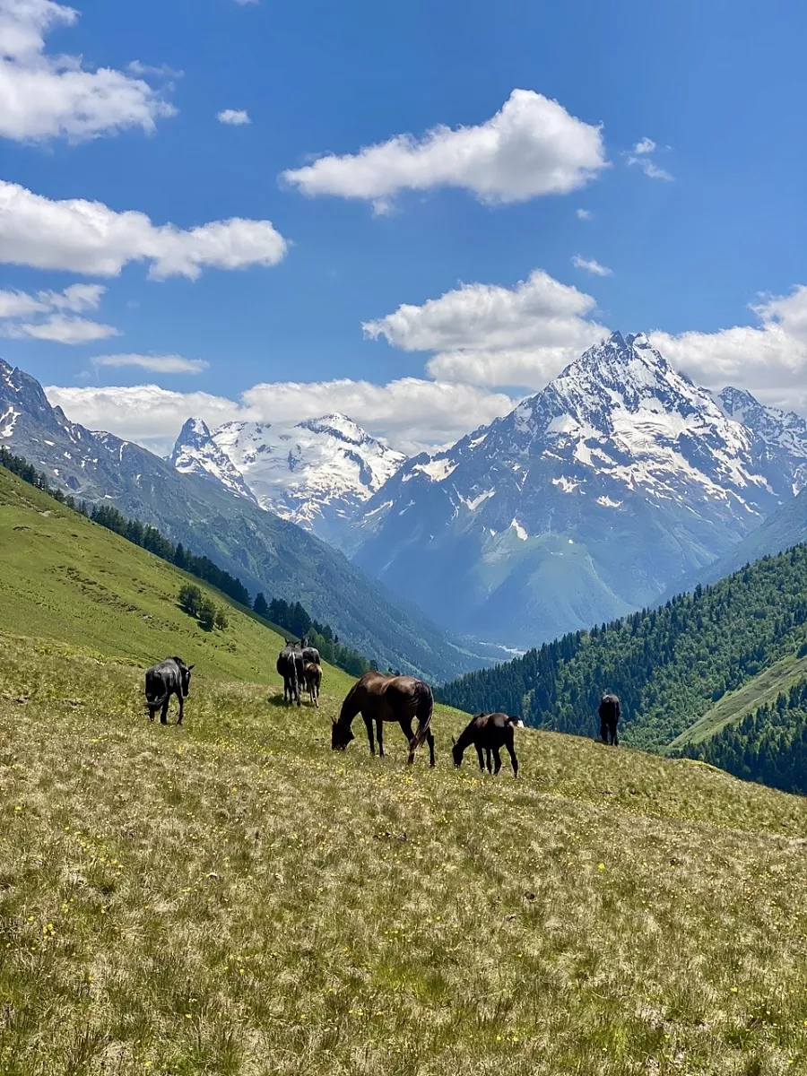 Десятки озер, спускающиеся с горных вершин, бурные потоки чистейших рек, суровые белоснежные вершины со сползающими вниз ледниками. Хребты и отроги, заросшие рододендроном, альпийские луга и реликтовый лес с исполинскими пихтами, которым по 400-700 лет, с флорой и фауной.