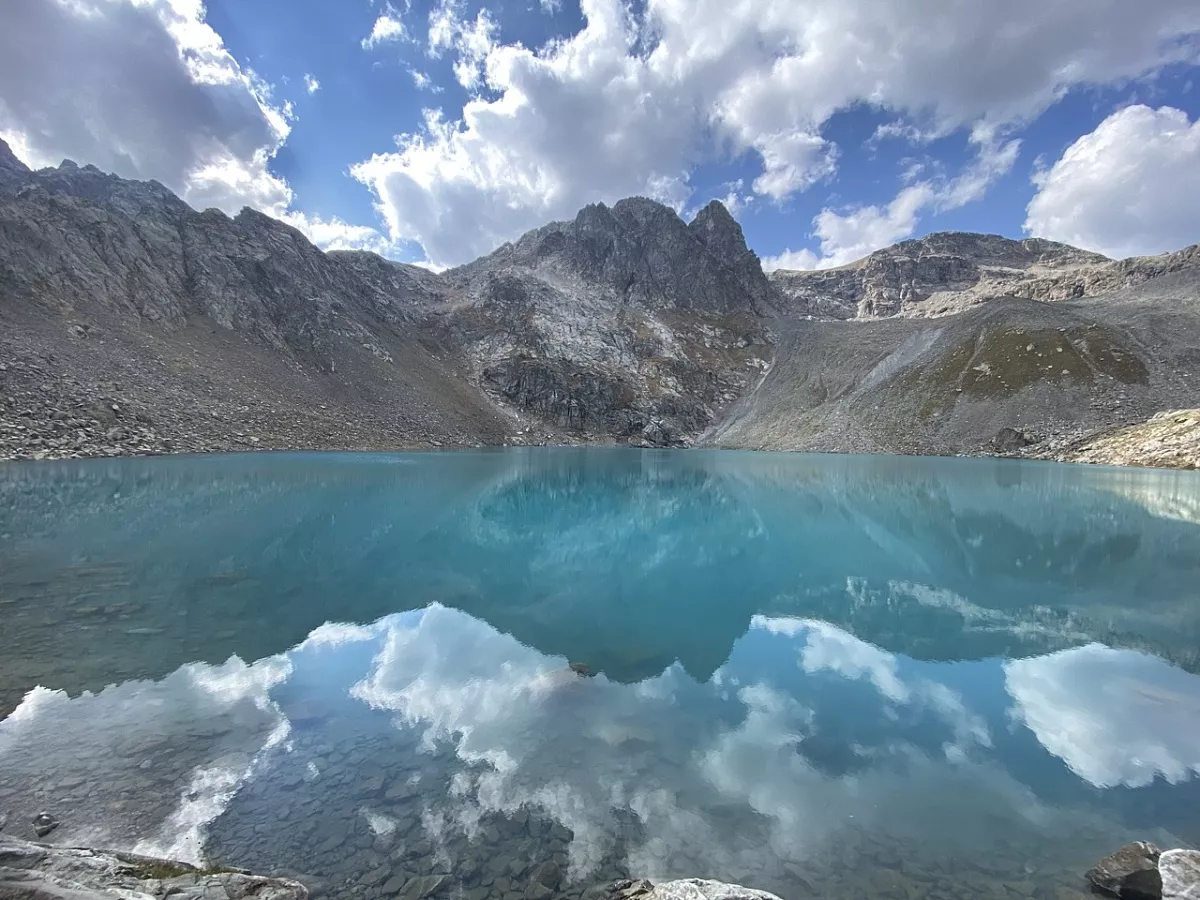Отдохнём и насладимся озерами, после чего продолжим наше путешествие, где сбросим 400 метров высоты и через пару километров пути нашему взору неожиданно предстанет еще одно изумрудное чудо с изрезанными берегами озеро Айматлы-Джагалы-Кёль, расположенное в ущелье реки Кашха-Эчкичат с зарослями рододендрона.