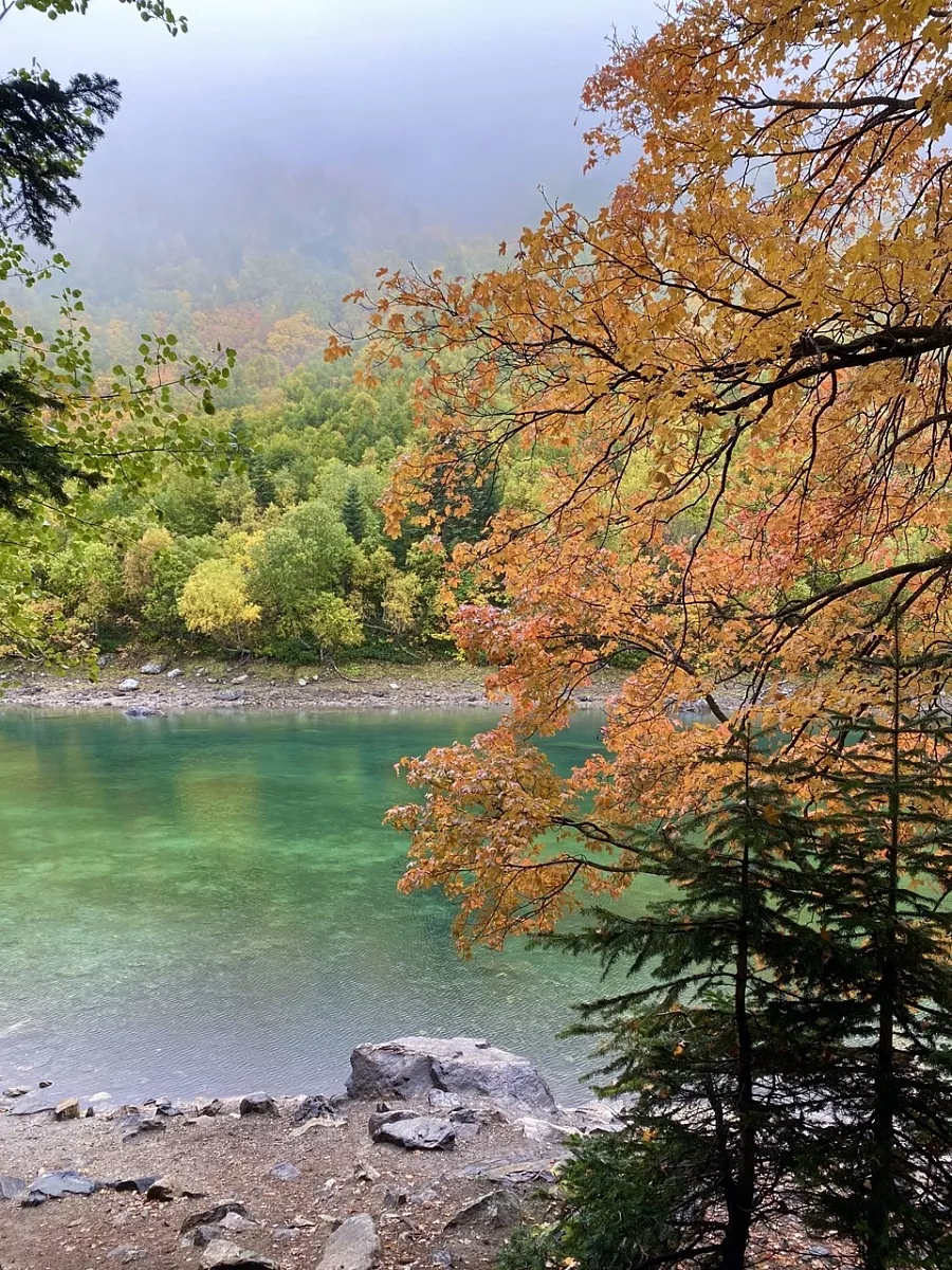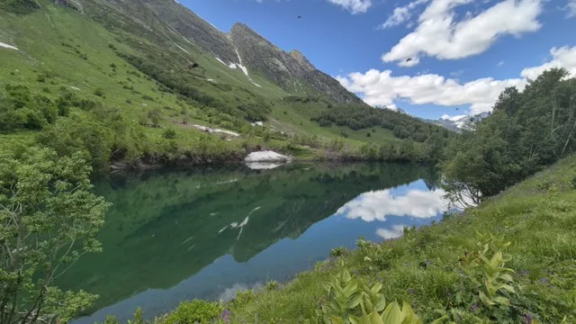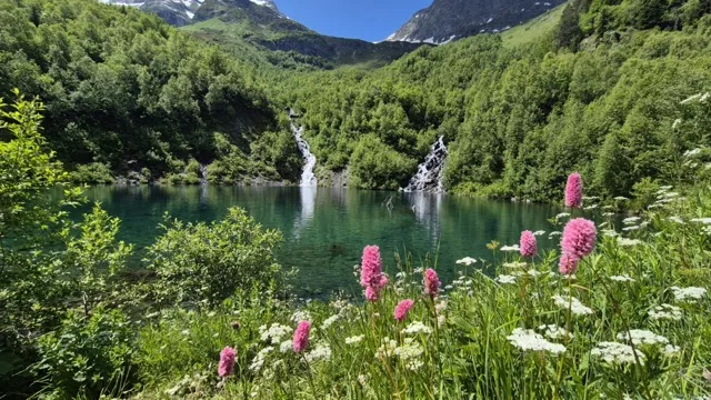 После отдыха у водопада мы продолжаем путь к Турьему озеру. Тропа идёт чуть выше, и вскоре лес сменяется каменными осыпями и горными лугами. На высоте 2180 метров среди скал лежит озеро маленькое, почти круглое, с водой цвета бирюзы. Даже летом она остаётся ледяной, ведь сюда стекают воды сразу двух ледников Алибека и Двуязычного. В ясную погоду в глади озера отражаются вершины, а иногда можно увидеть кавказских туров, осторожно подходящих к воде.