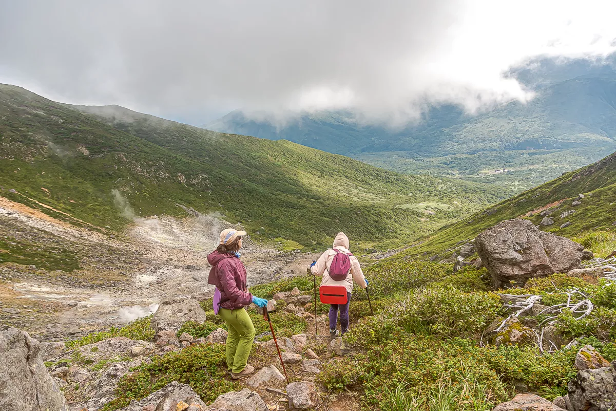 Осмотрев фумарольное поле, продолжаем наш путь дальше, на вершину вулкана. Подъем на вершину сложный и требует хорошей физической формы. Мы пойдем по узкой тропе с крутыми уступами через заросли кедрового стланника. На особо сложных участках провешены веревки. С вершины вулкана открываются великолепные виды на весь остров Кунашир, Хоккайдо и Шикотан.