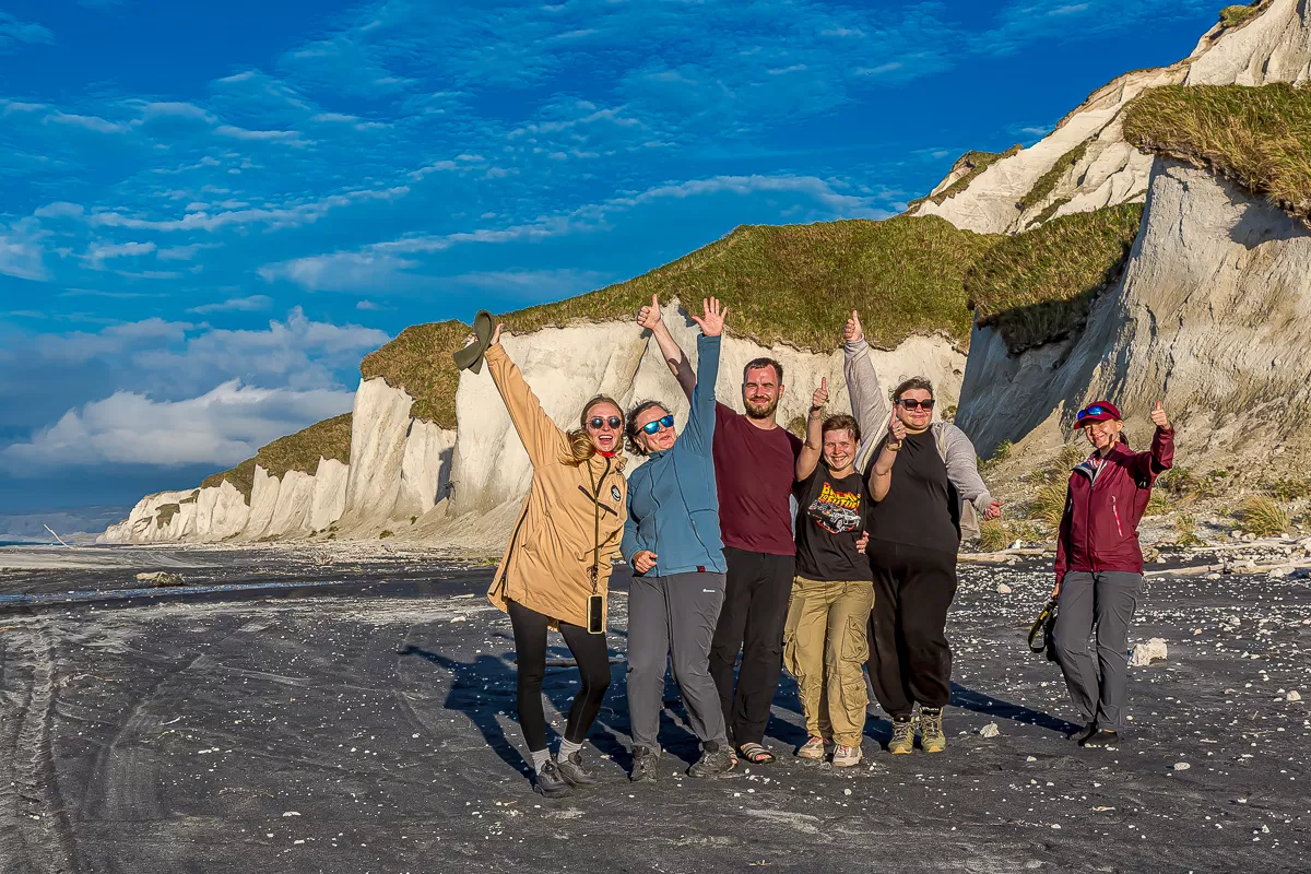 После прогулки мы увидим главную жемчужину Итурупа - ослепительные Белые скалы. Этот массив из мягкой светлой пемзы возник после извержения вулкана Баранского. Ветер и вода веками высекали здесь причудливые каньоны, превращая берег в инопланетный пейзаж. Белоснежные обрывы эффектно контрастируют с черным вулканическим песком и ярко-зелеными вершинами. По пути мы посетим Черные скалы уникальные базальтовые колонны пятигранной формы. Это место гарантирует вам лучшие кадры из всего путешествия.