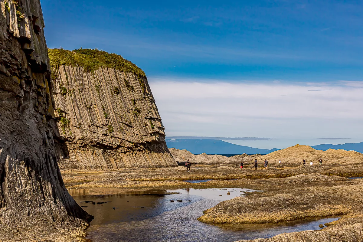 Утром выезжаем смотреть визитную карточку острова Кунашир мыс Столбчатый. Мыс находится на побережье Охотского моря в охранной зоне Курильского заповедника. Это уникальный объект, заповедник экструзий вулканических структур, образовавшихся в результате медленного выдавливания вязкой лавы, с последующим застыванием.