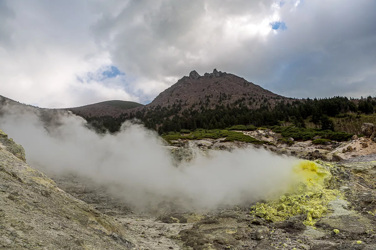 На машинах мы подъедем к началу пешей тропы. Длина пешего подъема около 3 км, это около 1,5 часов в один конец. Мы поднимемся примерно до половины высоты вулкана, до фумарольных полей с активными сольфатарами ярко-желтого цвета.