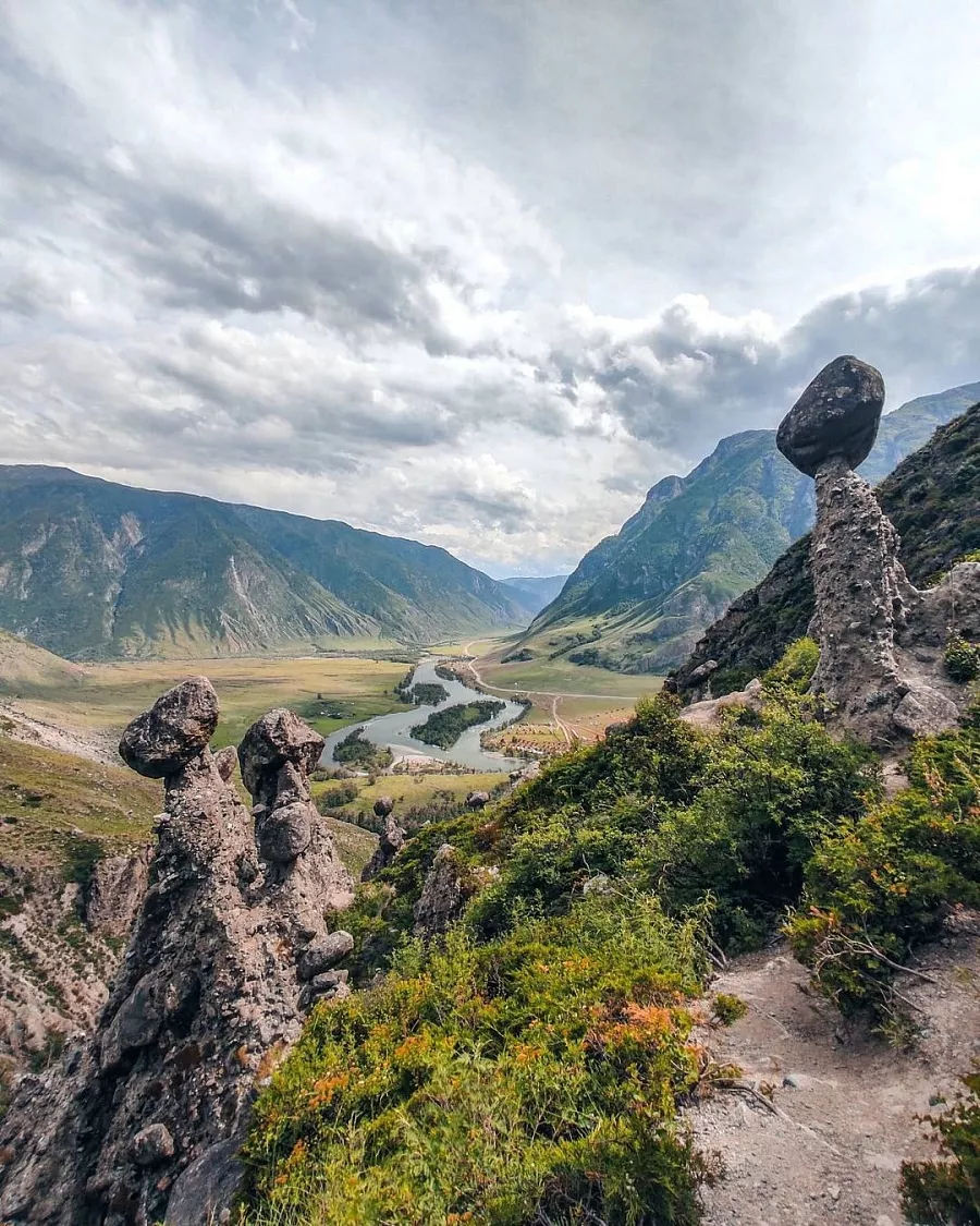 После обеда нас ждёт еще одно чудо природы, затаившееся в километре от нас уникальные Каменные грибы. Путь несложный и занимает около 50 минут. Немного подъема, и мы уже наверху. Здесь нас ожидает вот такой вид на долину Чулышман... Обзор на миллион!