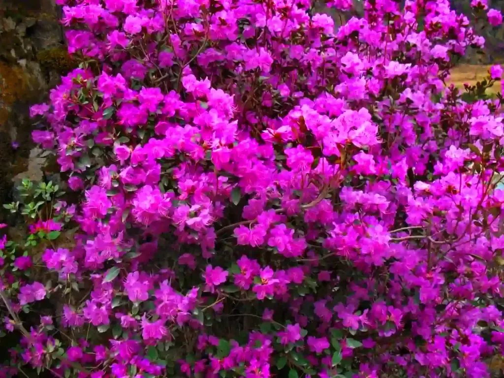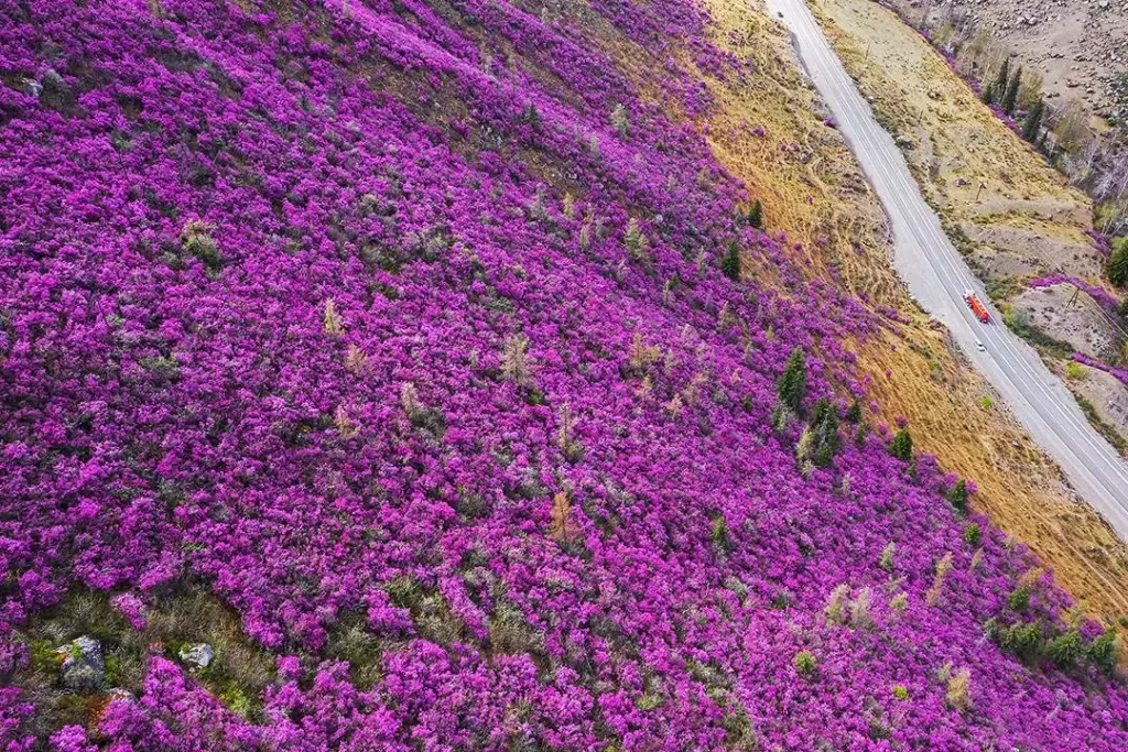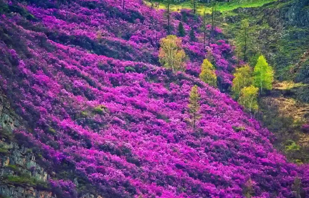Весной, в начале мая, на Алтае можно увидеть потрясающее зрелище: после зимнего сна, на фоне ещё заснеженных гор ярким фиолетово-розовым цветом бушует распустившийся маральник. Цветение длится всего неделю, а местность, где он цветёт, похожа на сказочный сиреневый ковёр. Цветы кустарника яркие, они охватывают огромные пространства, заполоняя собой все вокруг. Маральник растет только на Алтае, и увидеть это зрелище едут со всех уголков России и зарубежья, подобно тому, как туристы едут в Японию любоваться цветением сакуры.