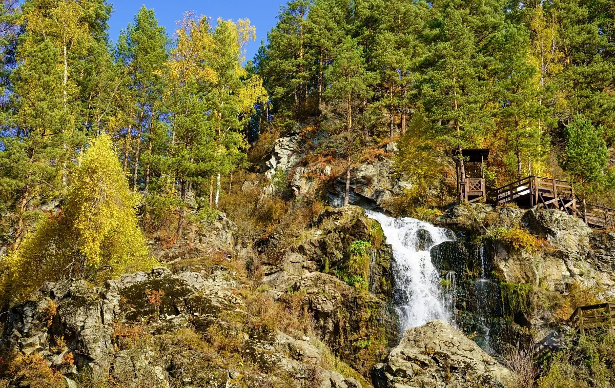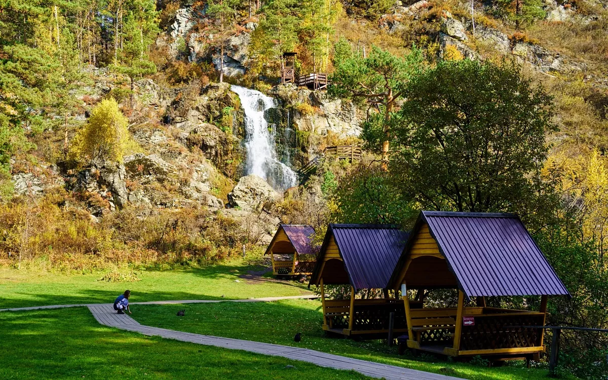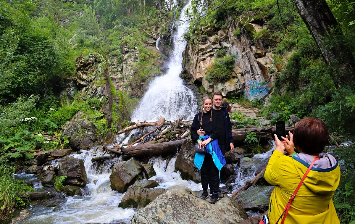 Экскурсия на Камышлинский водопад живописный водопад, на левом берегу р. Катунь, который состоит из двух каскадов общей высотой 12 метров. Чтобы до него добраться, необходимо перейти по пешеходному подвесному мосту через р. Катунь и подняться 2,5 км по тропинке вверх по течению. Камышлинский водопад является частью реки Камышла (буквальный перевод с алтайского языка: там, где есть камыш).