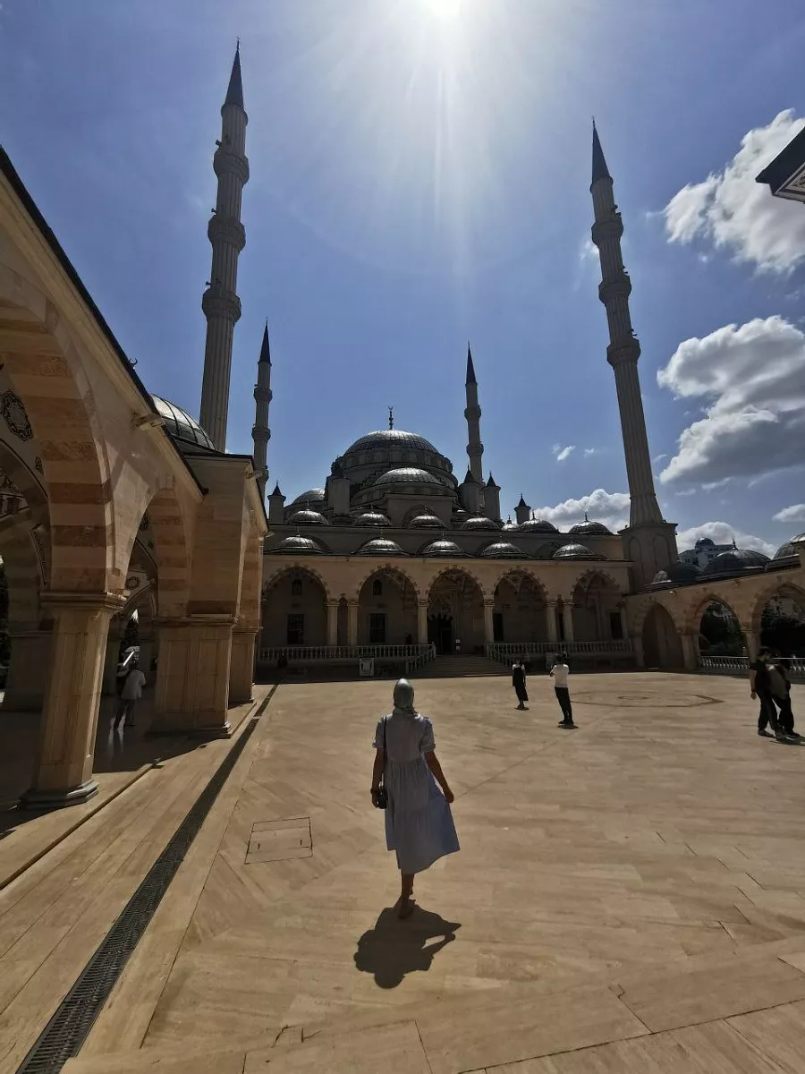 Конечно же посетим кафе и попробуем очень колоритную местную кухню. Следом мы направимся в ещё одну мечеть, которая откроет нам духовный мир мусульман Сердце Чечни. Примечательно, что данное сооружение строили турки, беря за основу проект Голубой мечети.