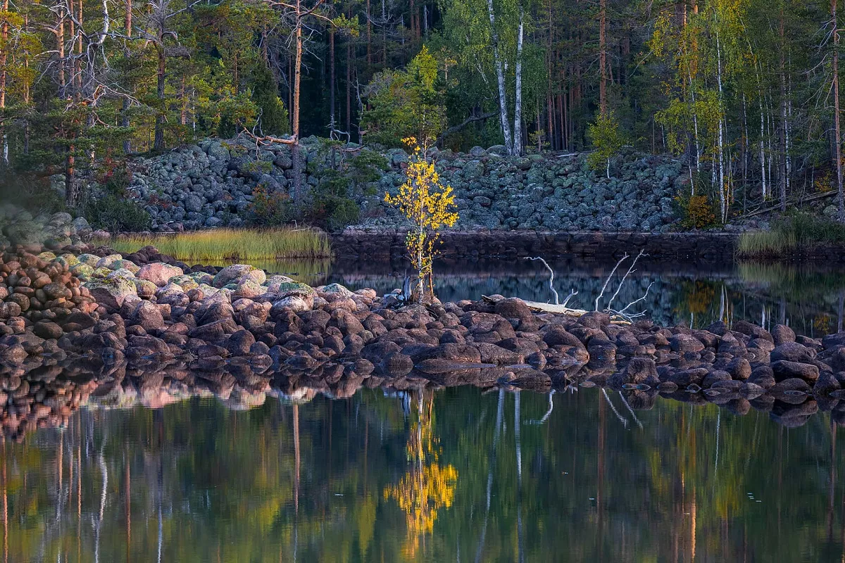 Это большая разноцветная скала в Ладожском озере, к которой ведет тропинка через древний еловый лес с замшелыми камнями.