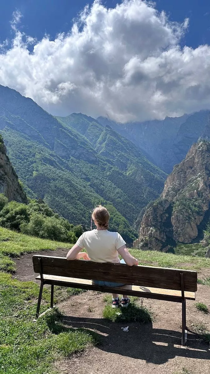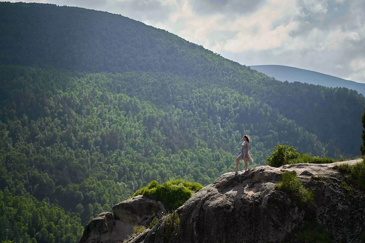 Сделаем кадры на фоне живописных скал-аватаров в долине реки Харбаз. Эти возвышенности словно инопланетный мир на Кавказе. Кажется, именно в этих чудных местах находится та самая Кипящая скала народа Огня. На этой уютной площадке расположены деревянные беседки, где можно отдохнуть, попробовать хмельного мёда и сочных хычинов.