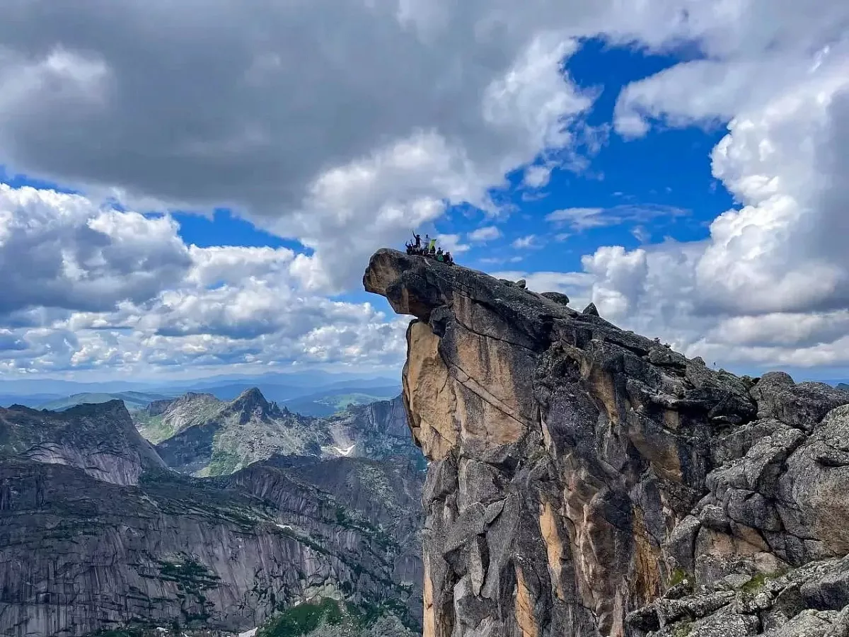 Скала заканчивается своеобразным козырьком, похожим на громадный зуб. Нас ожидает крутой и затяжной подъем, но наградой за труды станет необыкновенный вид на горные хребты, вершины и озера. Отсюда видно вершины Птица, Звездный, Парабола. Впечатления и эпичные фото гарантированы! С вершины можно увидеть всю красоту природного парка: его озера, долины и другие вершины.