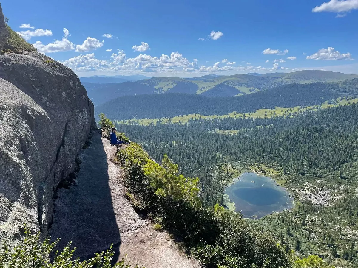Скала заканчивается своеобразным козырьком, похожим на громадный зуб. Нас ожидает крутой и затяжной подъем, но наградой за труды станет необыкновенный вид на горные хребты, вершины и озера. Отсюда видно вершины Птица, Звездный, Парабола. Впечатления и эпичные фото гарантированы! С вершины можно увидеть всю красоту природного парка: его озера, долины и другие вершины.