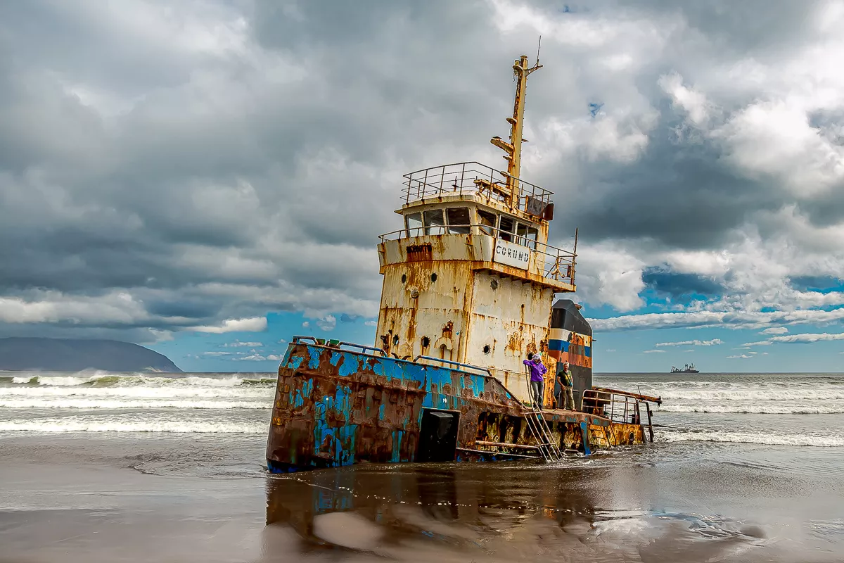 Затем мы пересечем весь остров к побережью Тихого океана. Вас ждет залив Касатка и легендарный Зеркальный пляж. Тонкий слой воды на черном песке создает эффект неба под ногами. Мы исследуем загадочные штольни мыса Тоннельный и увидим занесенный песком буксир Корунд.
