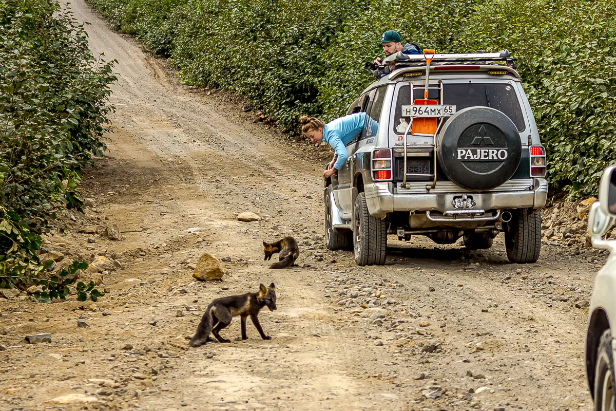 Гиды на каждом острове были прекрасными, машины разные, но почти все с лебедками — на островных дорогах это было очень уместно. На Итурупе один из автомобилей застрял на переправе к Белым скалам, и мы смогли помочь его вытащить.