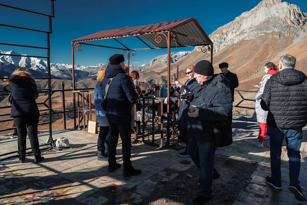 Третий день. Рано утром нас ожидала дорога в Грузию. Магомед, бывший военный, на своем комфортном минивэне Hyundai вёл нас через Кавказский хребет. Это было удивительное и комфортное путешествие: он рассказывал про реки, монастыри, крепости и башни. Остановка у Арки дружбы народов, Успенского собора в Ананури (XVII век) и некоторые другие достопримечательности сделали маршрут насыщенным. В дороге с нами — Мадина из Москвы, очень интеллигентная и приятная спутница. Поездка прошла быстро и безопасно.