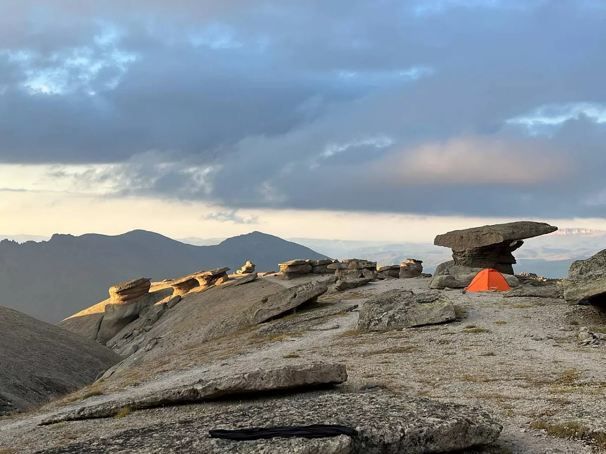 Акклиматизационный выход на Каменные грибы. Заброска часть снаряжения, для облегчения перехода на следующий день. Ночь домиках в лагере высоте 2500 м.
