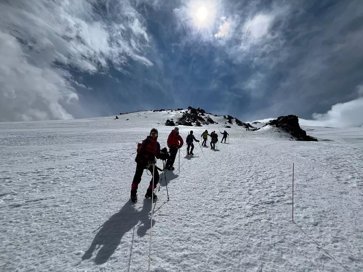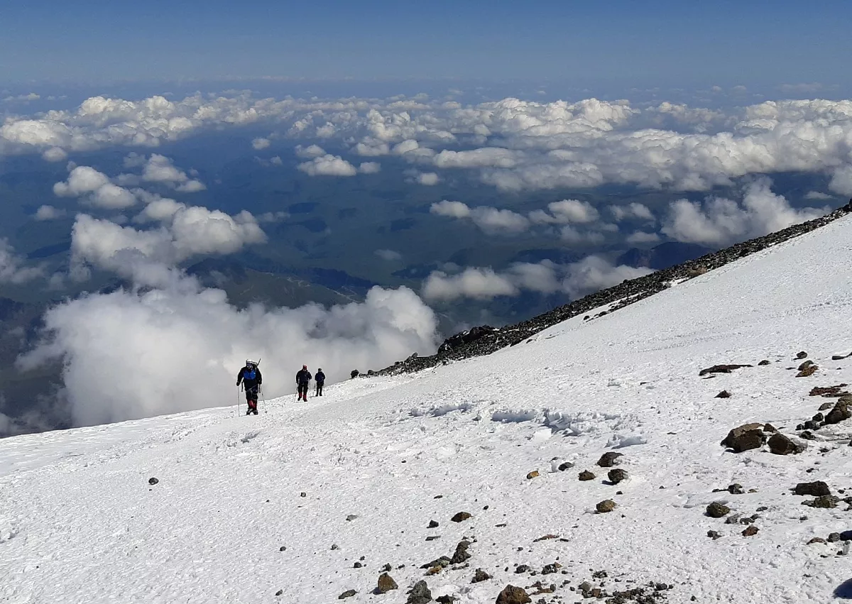 Восхождение на Эльбрус. Подъём в полночь, 1,5 часа на сборы. От штурмового лагеря идем в связках, в кошках, с ледорубами, касками и налобными фонарями. Идем очень медленно, чтобы не сбить дыхание и сохранить силы. Восхождение занимает 8-12 часов, спуск около 3-4 часов.