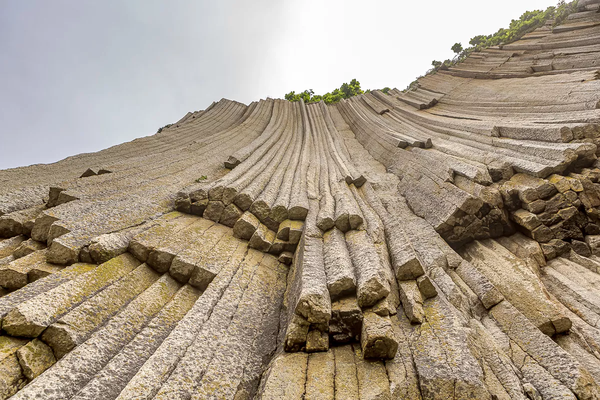 Утром выезжаем смотреть визитную карточку острова Кунашир - мыс Столбчатый. Мыс находится на побережье Охотского моря в охранной зоне Курильского заповедника. Это уникальный объект, заповедник экструзий вулканических структур, образовавшихся в результате медленного выдавливания вязкой лавы, с последующим застыванием. Мыс представляет собой живописные отвесные скалы высотой до 50 м, вдающиеся в Кунаширский пролив несколькими выступами, которые сложены наслоениями базальтовых лав вулкана Менделеева, застывших в виде пяти- и шестигранных колонн. В некоторых местах колонны напоминают церковный орган, в других мостовую и даже черепаху.