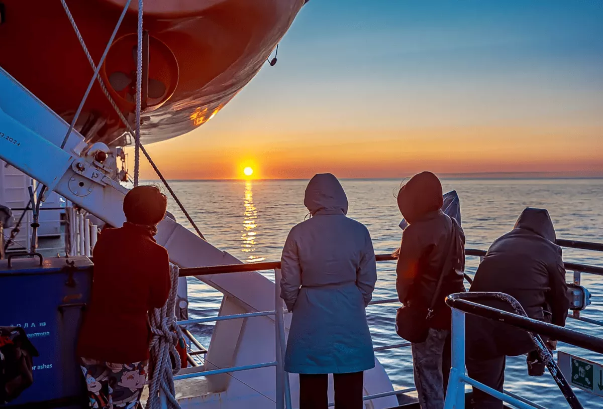 На пароме нас ждет морской круиз до острова Шикотан. Во время круиза у нас будет хороший шанс встретить стаи дельфинов, косаток и китов. Мы пройдем мимо маяка Анива, красиво подсвеченного закатным солнцем, и выйдем в Охотское море, где встретим закат вдали от берегов.