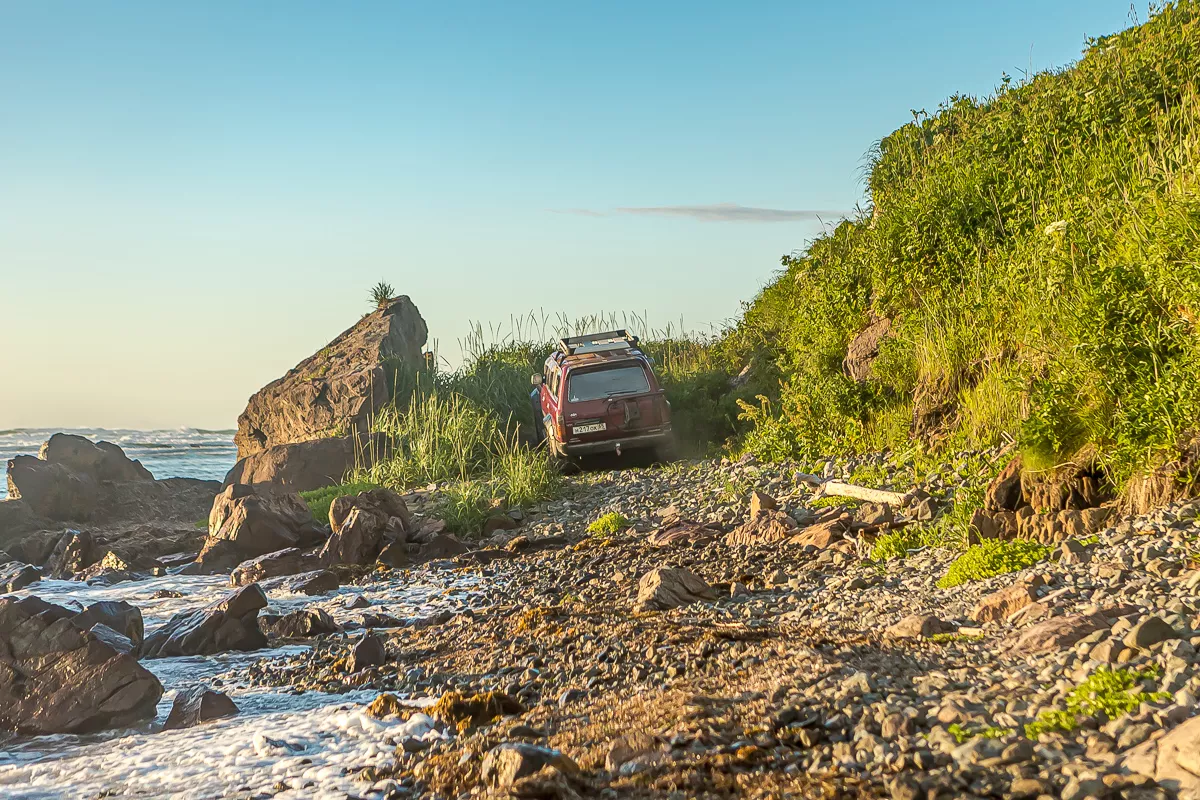 Гиды на каждом острове были прекрасными, машины разные, но почти все с лебедками — на островных дорогах это было очень уместно. На Итурупе один из автомобилей застрял на переправе к Белым скалам, и мы смогли помочь его вытащить.