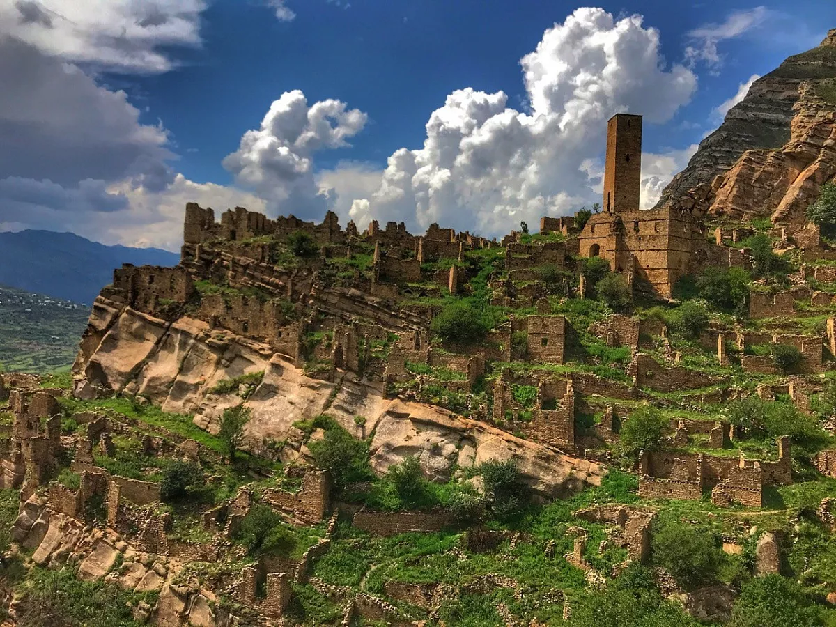 Село призрак Гамсутль, потрясающий вид со стороны на село Гуниб. Несмотря на то, что горный аул Гумсутль давно заброшен и находится в труднодоступном месте, высоко в горах, поток туристов туда не иссякает. Еще несколько десятилетий назад в аул вела автодорога, но сегодня от нее осталась только узкая тропа.Подняться к аулу можно пешком. За дополнительную плату можно доехать на джипах местных жителей.