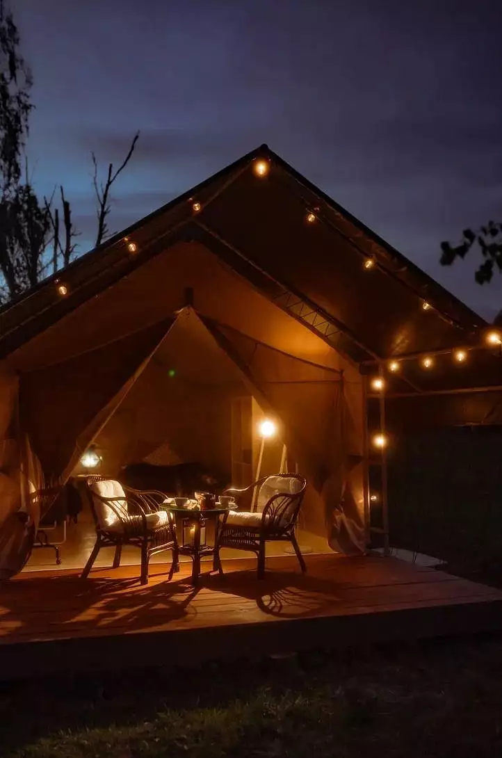 Ближайшие две ночи мы располагаемся в сафари-тентах по 2 человека. Все удобства отдельно на территории. Эту волшебную локацию мы выбираем за потрясающие закаты, берег реки Катунь, отсутствие других туристических комплексов и обалденный горячий чан с баней.