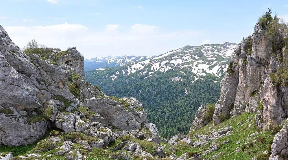 В 350 метрах от пещеры по лесной тропинке можно пройти к смотровой площадке, где открываются шикарные виды на часть Большого Кавказского хребта со снежными вершинами.