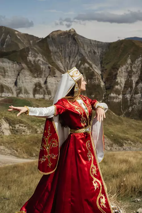 Вас будут снимать в двух образах – развевающемся шелковом платье в пол со шлефом, которые сконструировано по лекалам специально для нас. Второй образ будет историческим – национальное платье с невероятной красоты узорами. После каждого тура все образы мы отдаем в химчистку. На осенний период предусмотрен утепленный вариант.