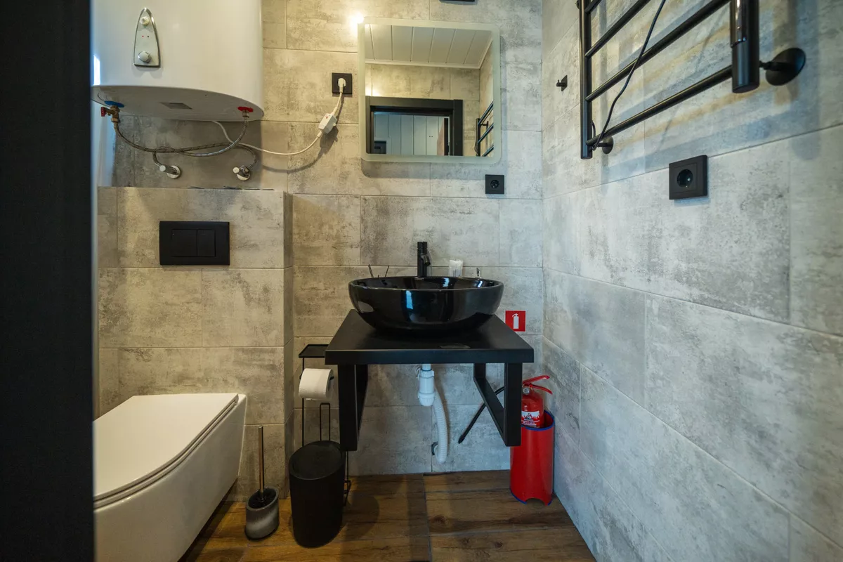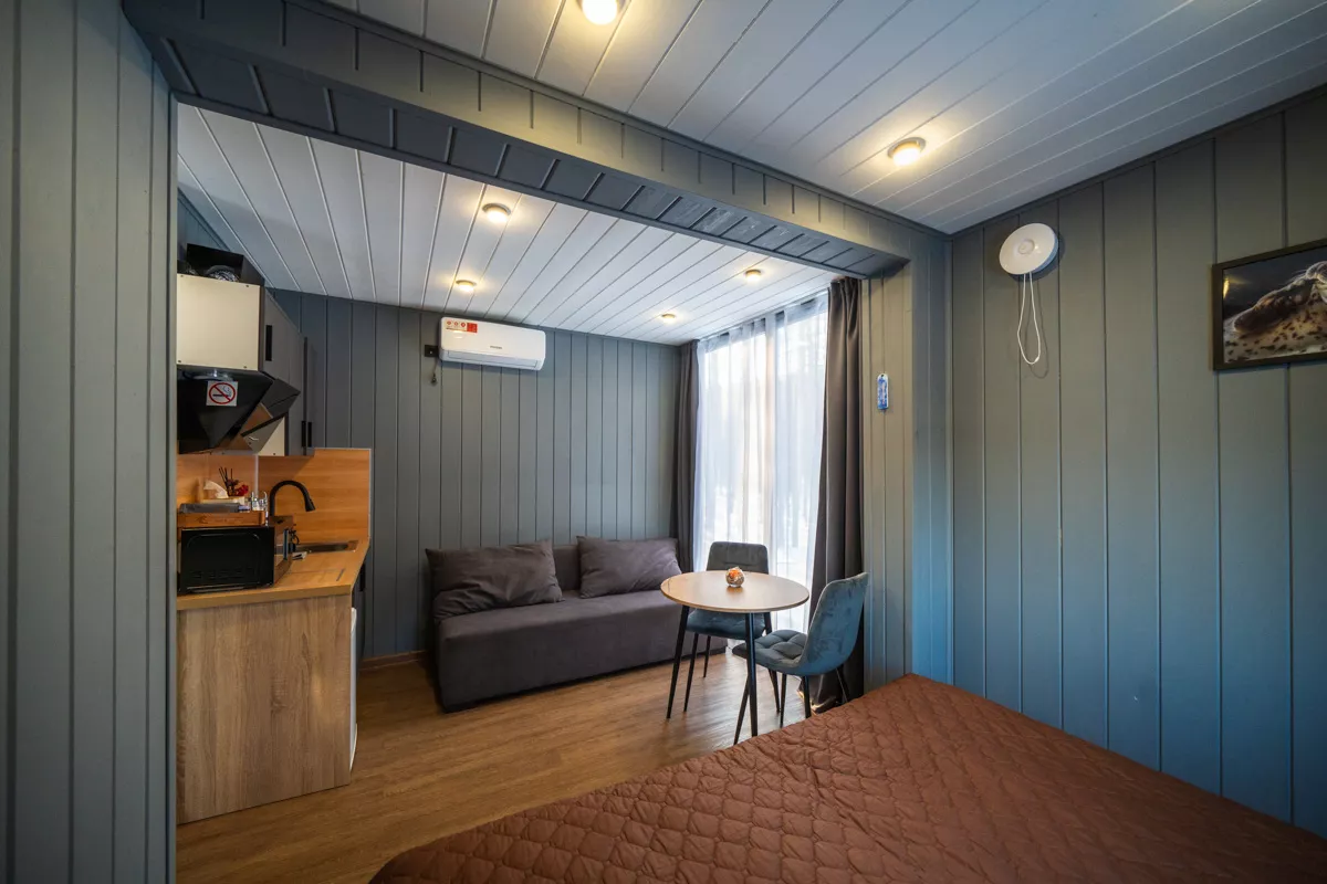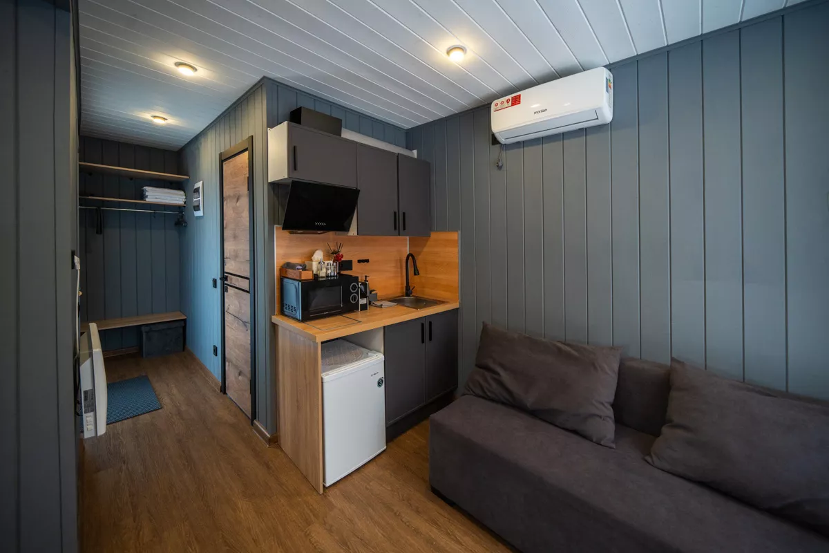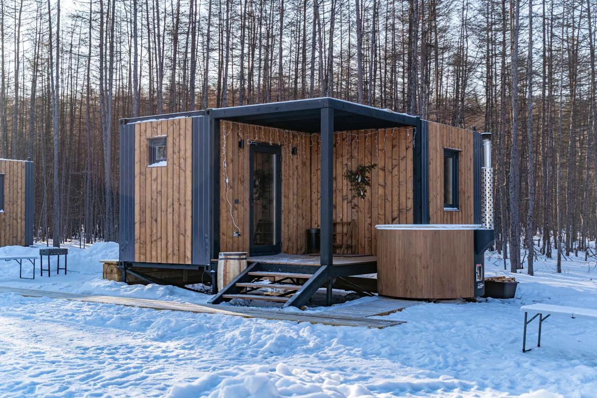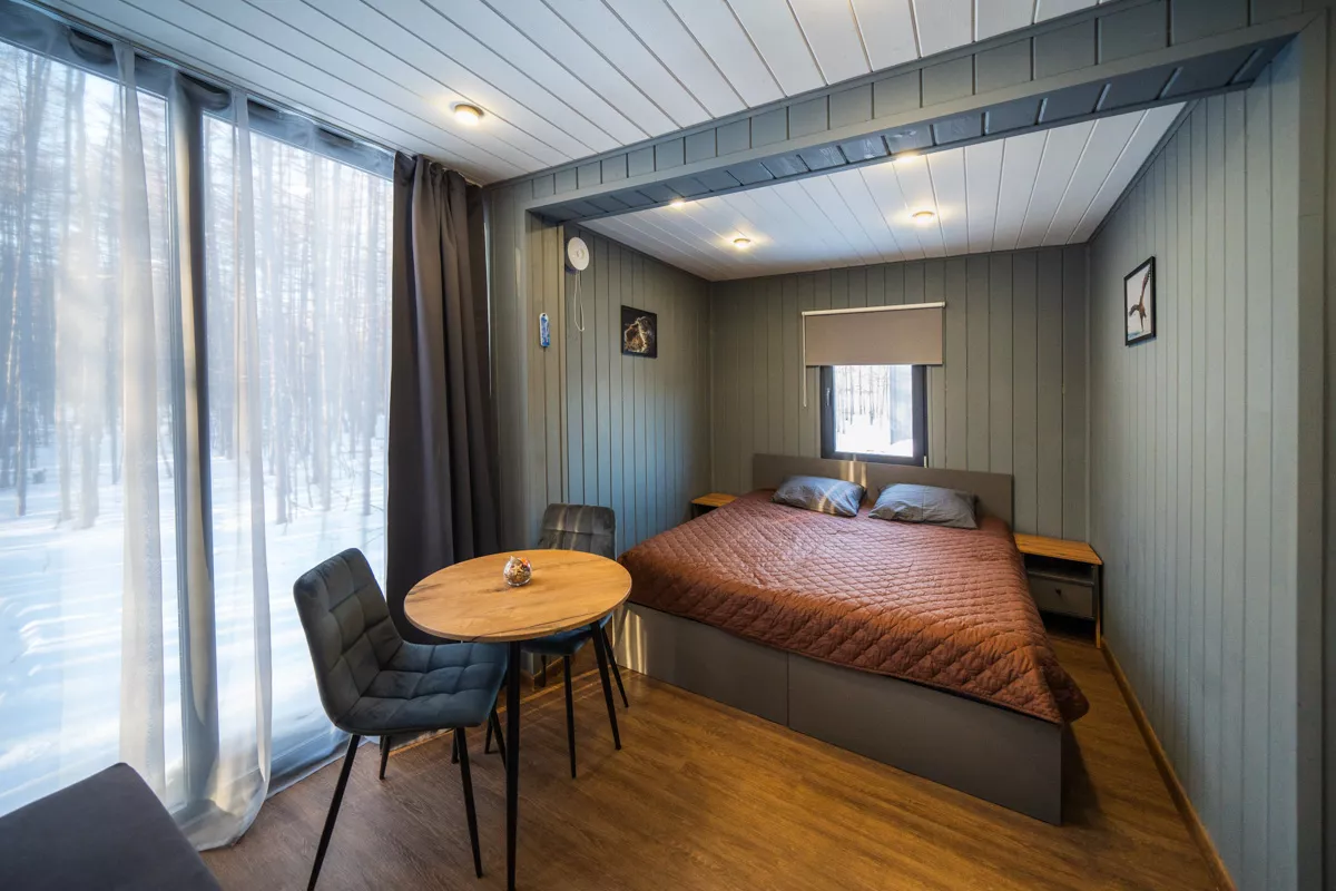 В деревне современные домики с террасой типа Арт хаус. В каждом домике находятся кровати с матрацами и постельным бельем, умывальник, туалет, стол и кресла, тумбочка, вешалка, панорамное окно, розетки для гаджетов, система отопления, тёплые полы и кондиционер. В домиках Арт хаус есть душ с горячей водой. Возле всех домиков установлены купели с подогревом и подсветкой. В течении тура будет организовано посещение авторской бани в селе Датта.
