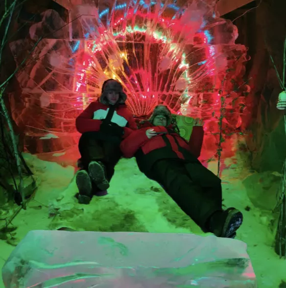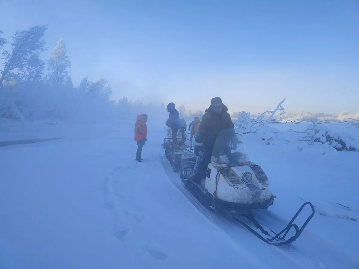 11:10. Приезд в село. Зимой темнеет рано, поэтому сразу поедем на снегоходах в маршрут охотника, где проверим капканы, силки и плашки. По пути встречаемся с хозяйкой реки Индигирка Индигир-Хотуном.