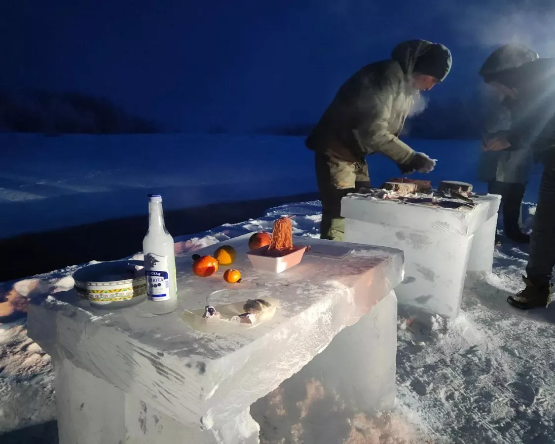 Выставка экстремального холода у реки Индигирка. Возможность приготовить строганину своими руками якутским ножом из местной рыбы.